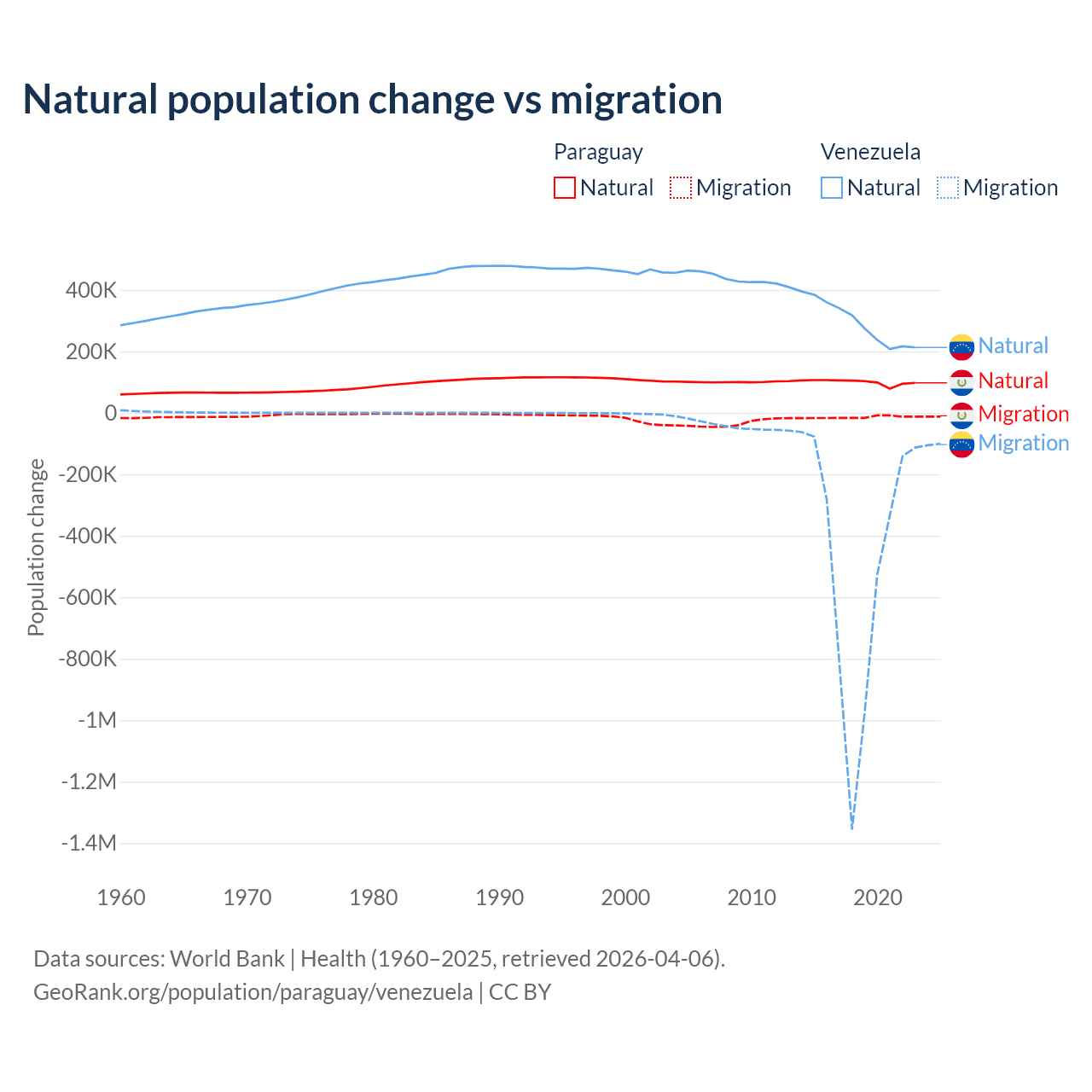 Over the last 10 years, 87.6% of the population change in Paraguay is from natural causes (a gain of 1,002,636 people) and 12.4% is from migration (a loss of 141,377 people). In Venezuela 38.6% is from natural causes (a gain of 2,946,257 people) and 61.4% is from migration (a loss of 4,683,227 people).