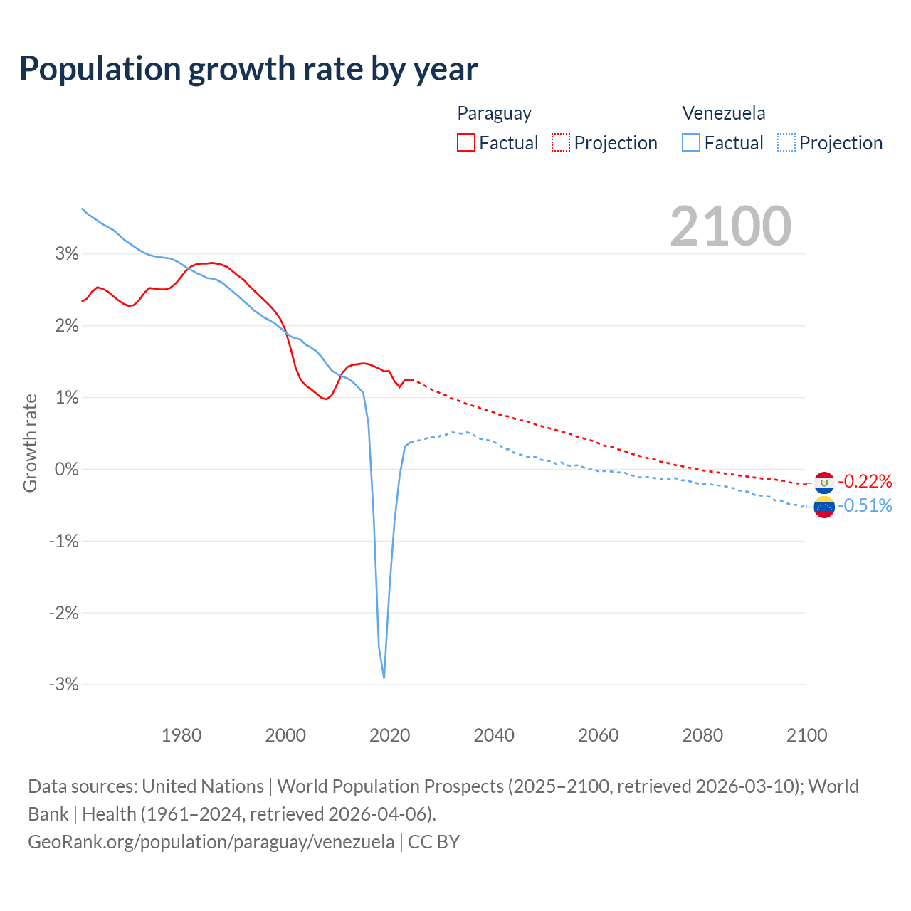 - For the last 10 years, Paraguay has had an average growth rate of +1.34% per year vs -0.46% in Venezuela.