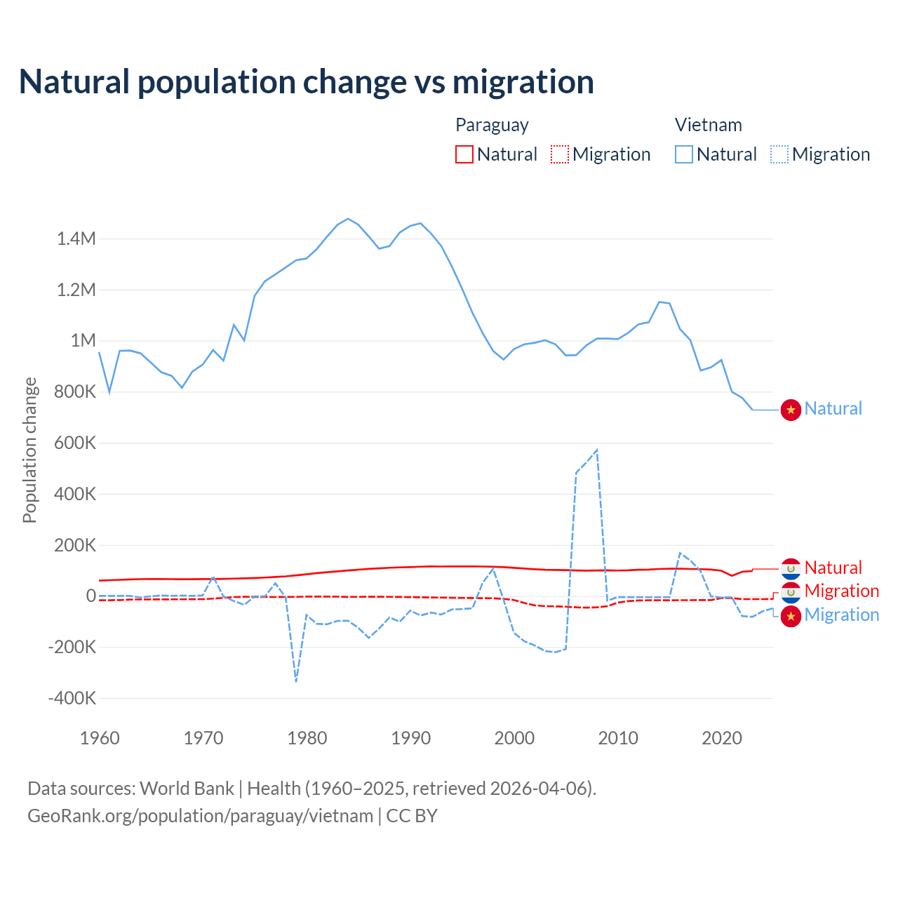 Over the last 10 years, 87.6% of the population change in Paraguay is from natural causes (a gain of 1,002,636 people) and 12.4% is from migration (a loss of 141,377 people). In Vietnam 97.7% is from natural causes (a gain of 9,349,756 people) and 2.29% is from migration (a gain of 219,073 people).