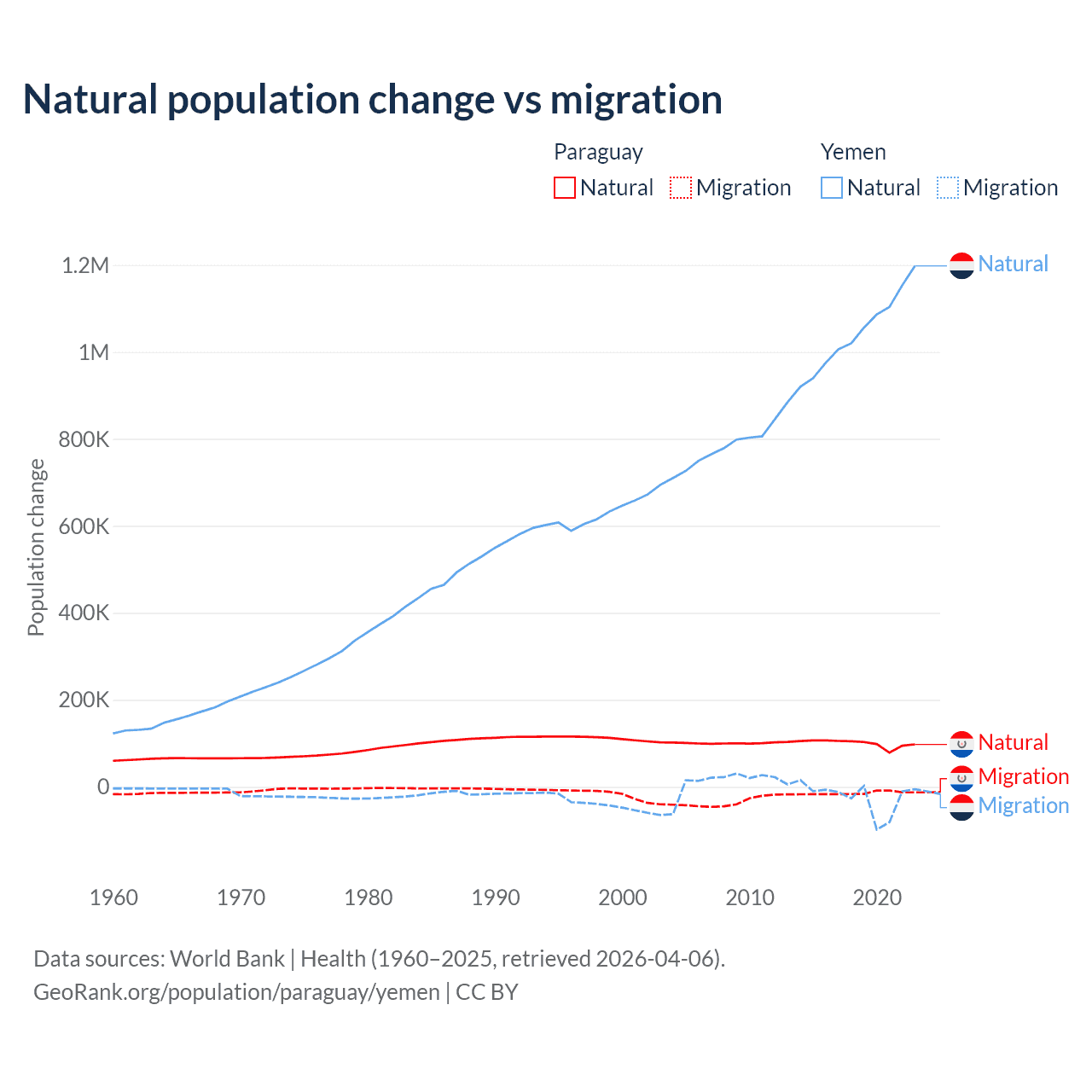 Over the last 10 years, 87.6% of the population change in Paraguay is from natural causes (a gain of 1,002,636 people) and 12.4% is from migration (a loss of 141,377 people). In Yemen 97.8% is from natural causes (a gain of 10,460,813 people) and 2.17% is from migration (a loss of 231,814 people).