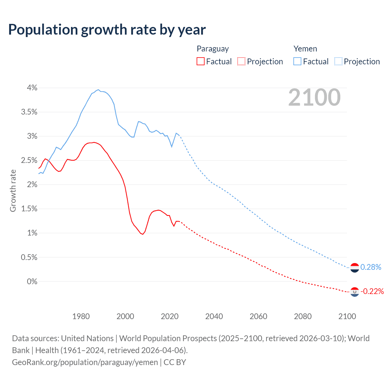 - For the last 10 years, Paraguay has had an average growth rate of +1.34% per year vs +3% in Yemen.