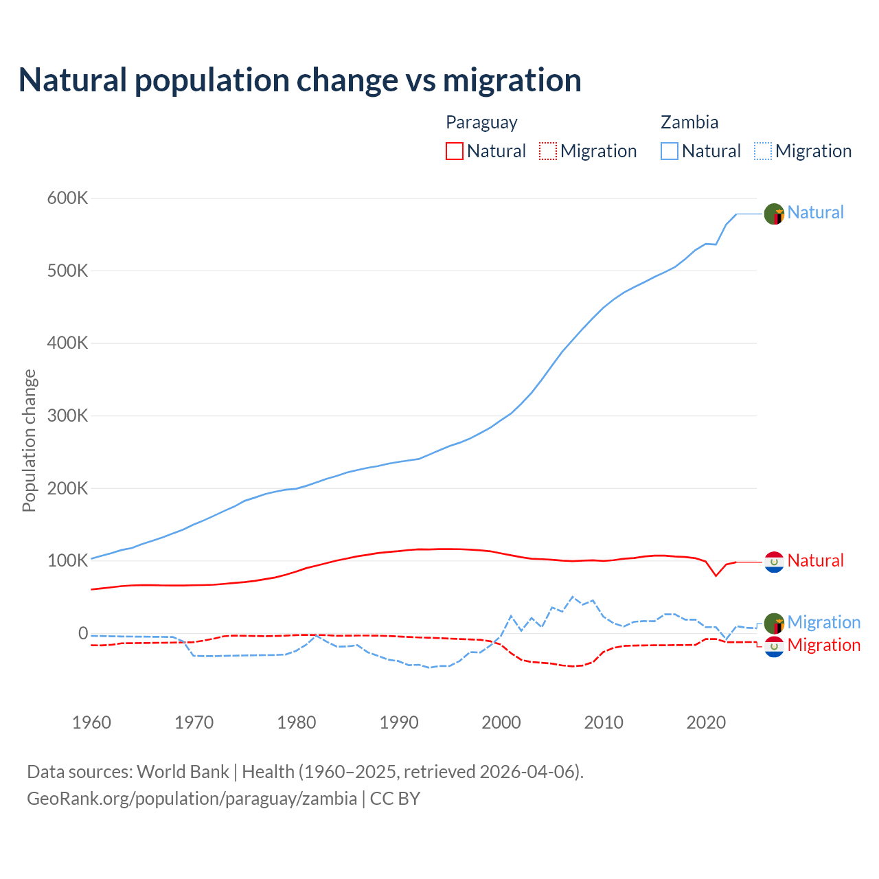 Over the last 10 years, 87.6% of the population change in Paraguay is from natural causes (a gain of 1,002,636 people) and 12.4% is from migration (a loss of 141,377 people). In Zambia 97.4% is from natural causes (a gain of 5,233,797 people) and 2.58% is from migration (a gain of 138,554 people).