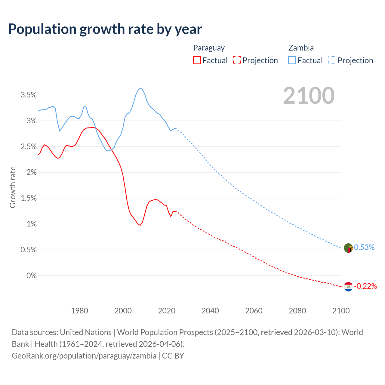 - For the last 10 years, Paraguay has had an average growth rate of +1.34% per year vs +3% in Zambia.