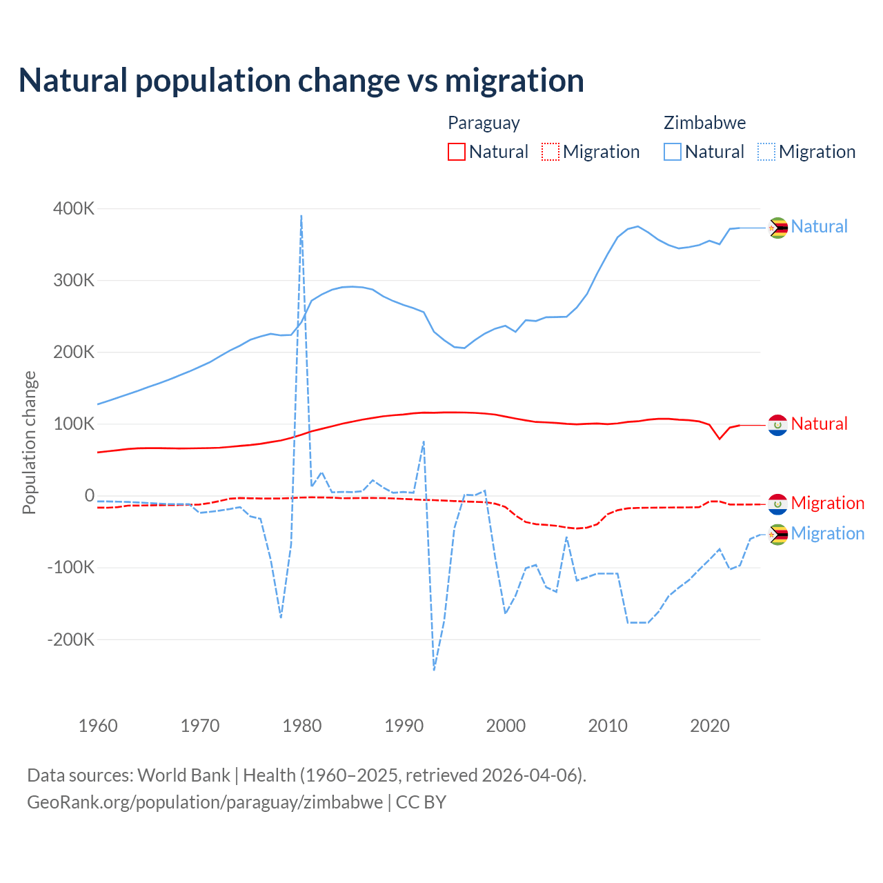Over the last 10 years, 87.6% of the population change in Paraguay is from natural causes (a gain of 1,002,636 people) and 12.4% is from migration (a loss of 141,377 people). In Zimbabwe 74.9% is from natural causes (a gain of 3,558,487 people) and 25.1% is from migration (a loss of 1,192,807 people).