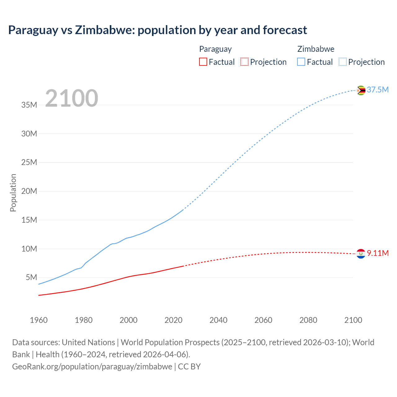 The latest officially reported population of Paraguay was 6,929,153 in 2024 vs 16,634,373 people in Zimbabwe in 2024. In 2026, based on the adjusted UN estimation, the current Paraguay's population is 7,120,169 people compared to 17,361,868 in Zimbabwe.