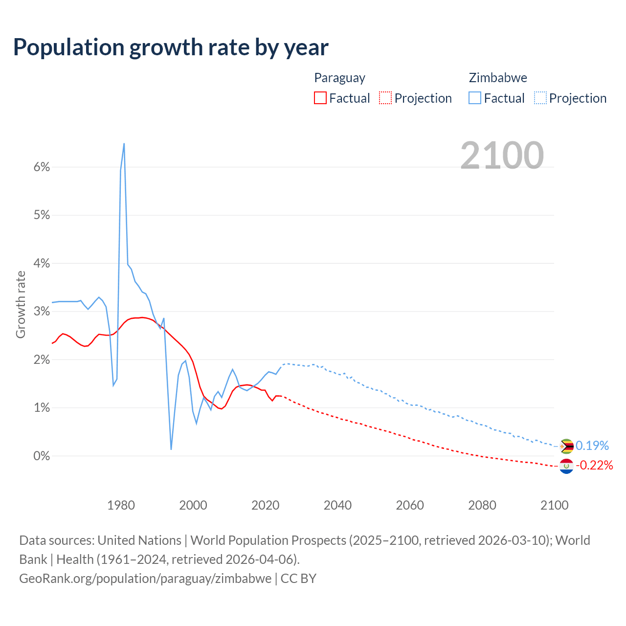 - For the last 10 years, Paraguay has had an average growth rate of +1.34% per year vs +1.57% in Zimbabwe.