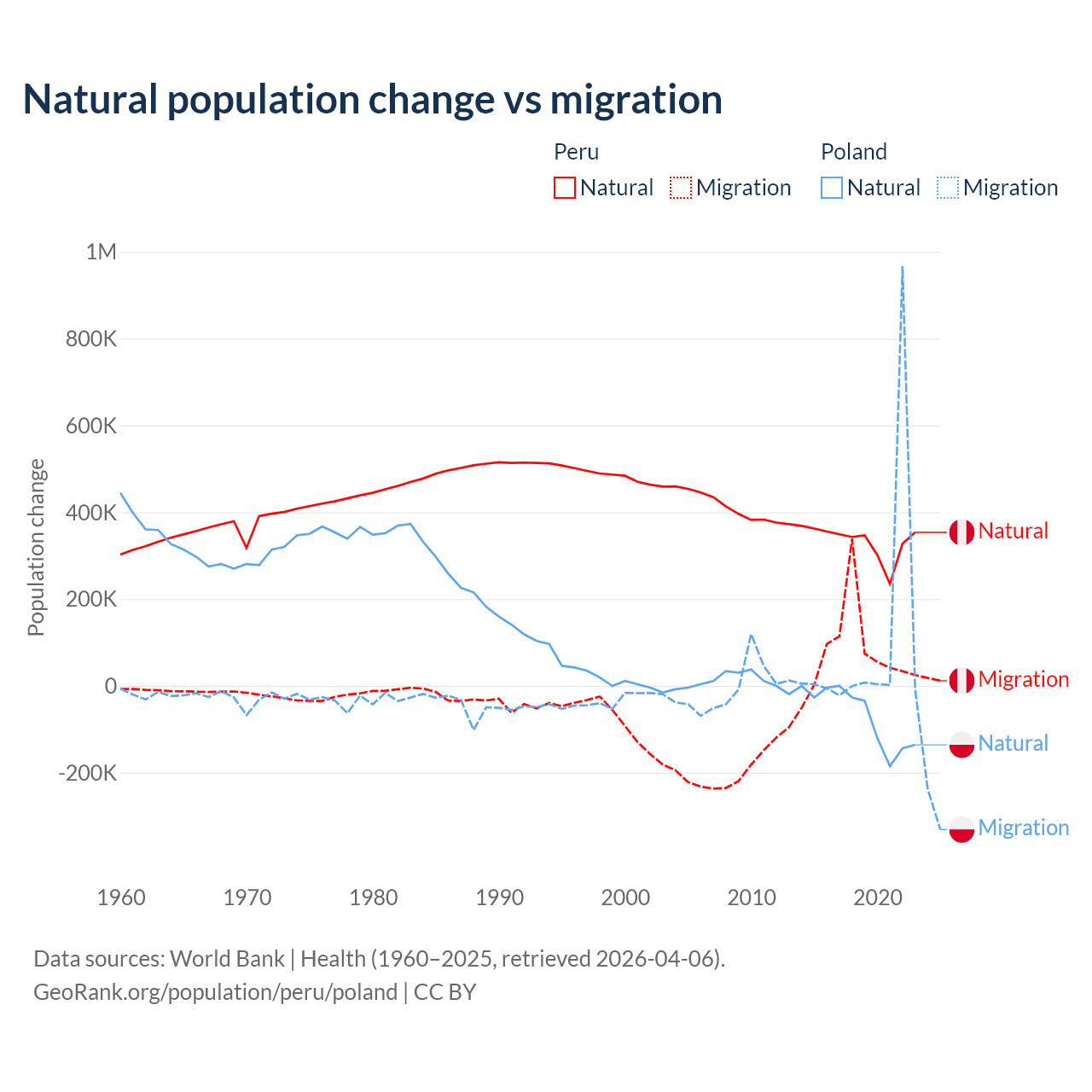 Over the last 10 years, 82% of the population change in Peru is from natural causes (a gain of 3,345,822 people) and 18% is from migration (a gain of 732,505 people). In Poland 41.4% is from natural causes (a loss of 675,443 people) and 58.6% is from migration (a gain of 955,766 people).
