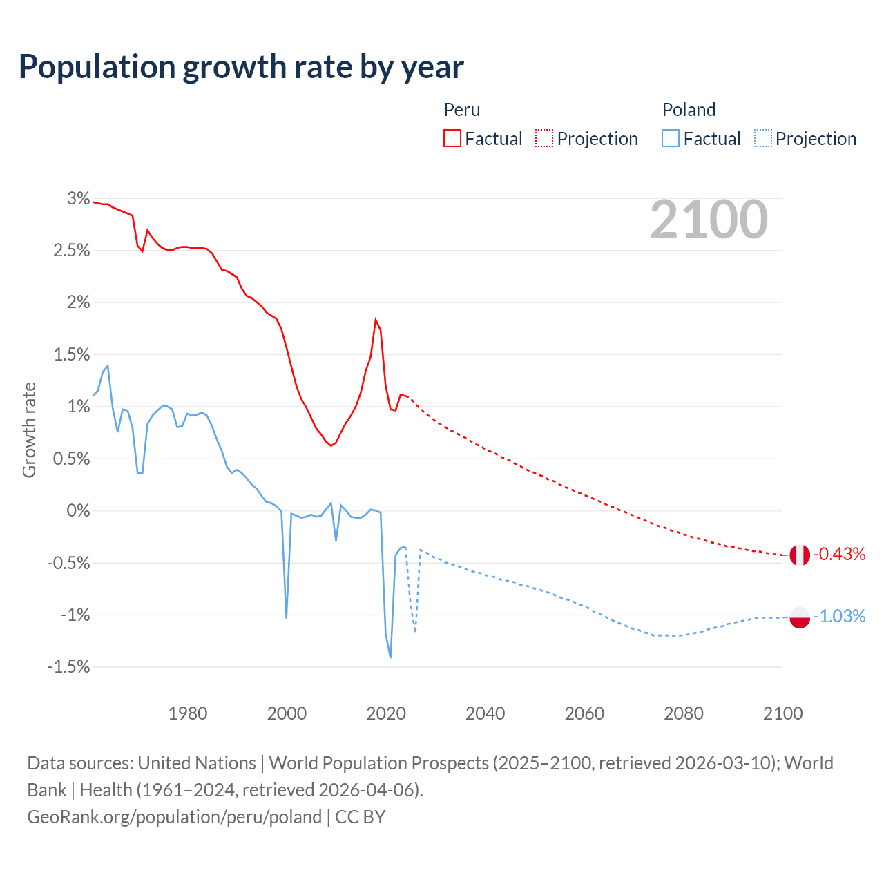 - For the last 10 years, Peru has had an average growth rate of +1.26% per year vs -0.36% in Poland.