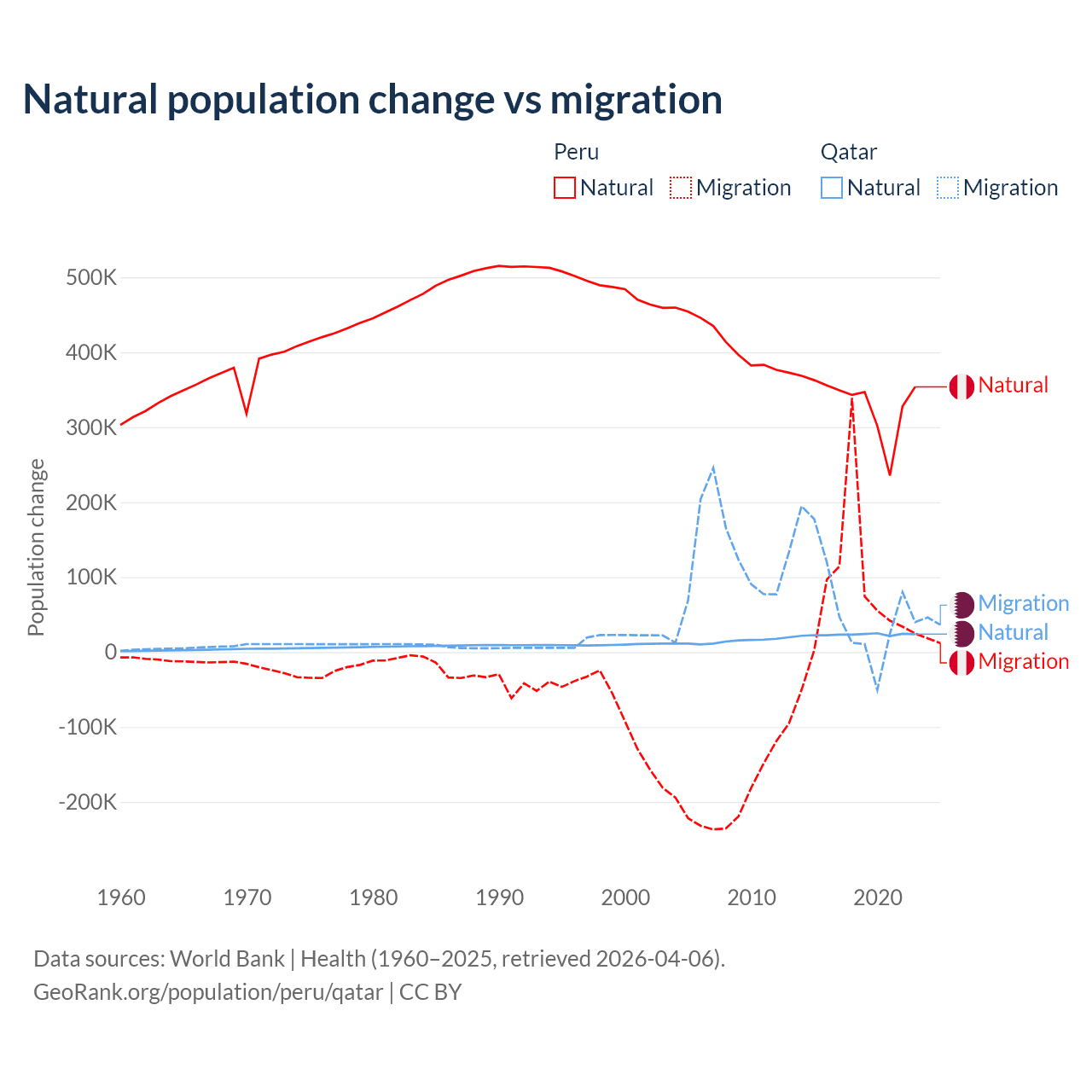 Over the last 10 years, 82% of the population change in Peru is from natural causes (a gain of 3,345,822 people) and 18% is from migration (a gain of 732,505 people). In Qatar 26.1% is from natural causes (a gain of 232,009 people) and 73.9% is from migration (a gain of 655,712 people).