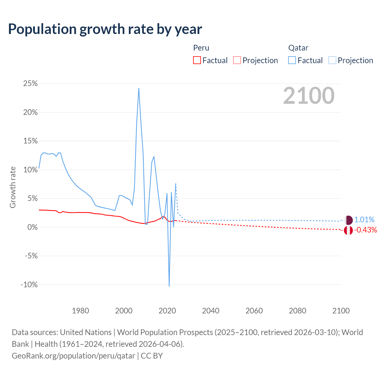 - For the last 10 years, Peru has had an average growth rate of +1.26% per year vs +3.86% in Qatar.