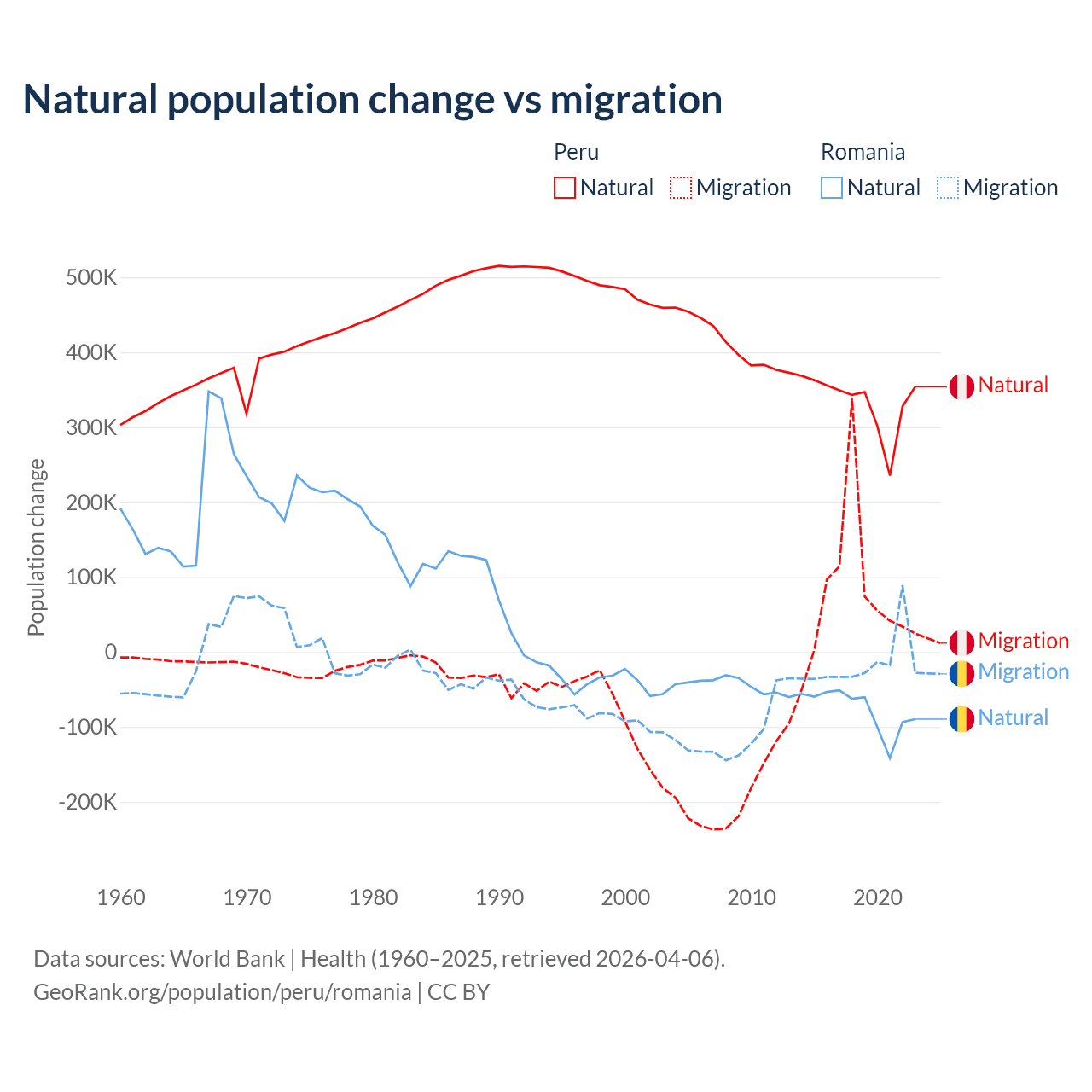 Over the last 10 years, 82% of the population change in Peru is from natural causes (a gain of 3,345,822 people) and 18% is from migration (a gain of 732,505 people). In Romania 82% is from natural causes (a loss of 766,295 people) and 18% is from migration (a loss of 167,917 people).
