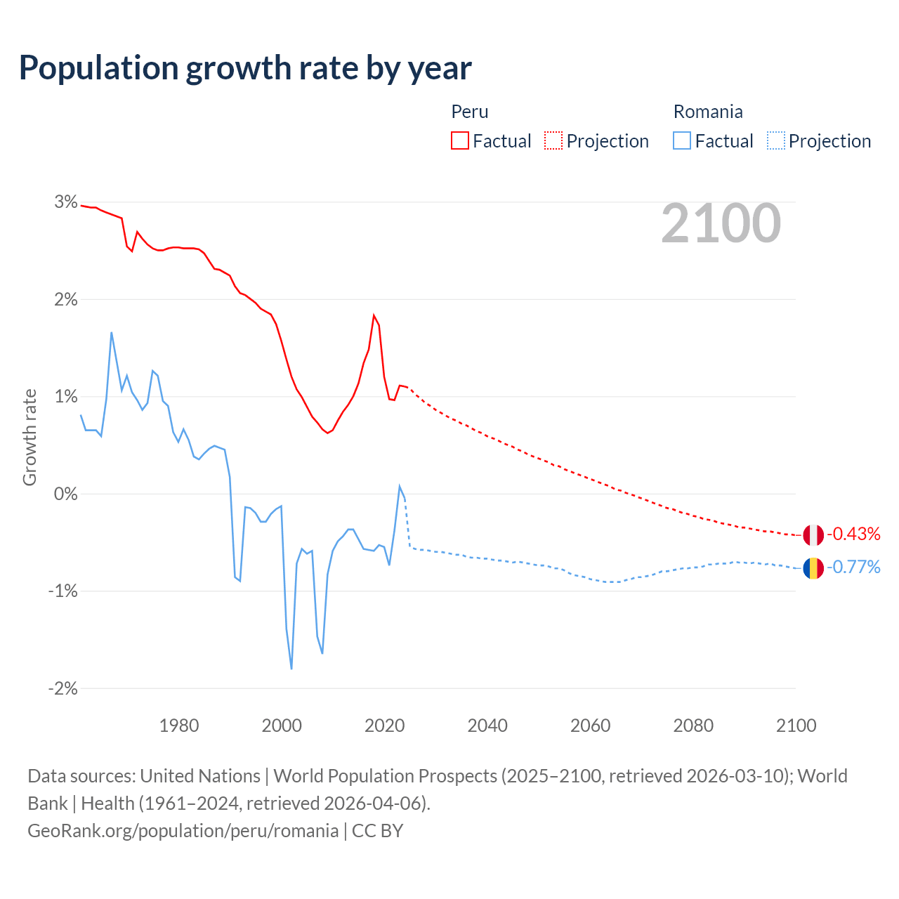 - For the last 10 years, Peru has had an average growth rate of +1.26% per year vs -0.43% in Romania.