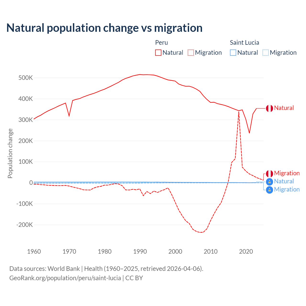 Over the last 10 years, 82% of the population change in Peru is from natural causes (a gain of 3,345,822 people) and 18% is from migration (a gain of 732,505 people). In Saint Lucia 95.7% is from natural causes (a gain of 6,039 people) and 4.31% is from migration (a loss of 272 people).