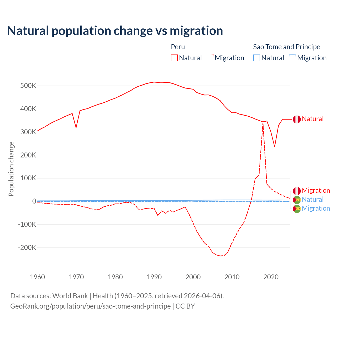 Over the last 10 years, 82% of the population change in Peru is from natural causes (a gain of 3,345,822 people) and 18% is from migration (a gain of 732,505 people). In Sao Tome and Principe 80.1% is from natural causes (a gain of 50,822 people) and 19.9% is from migration (a loss of 12,621 people).