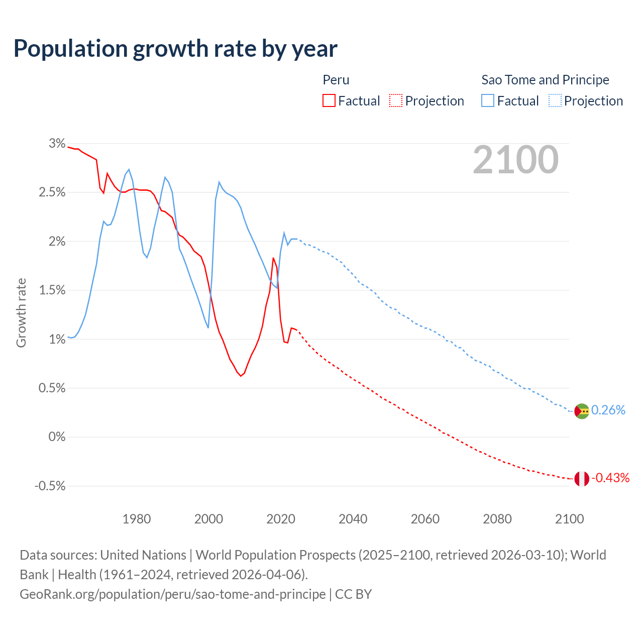 - For the last 10 years, Peru has had an average growth rate of +1.26% per year vs +1.82% in Sao Tome and Principe.