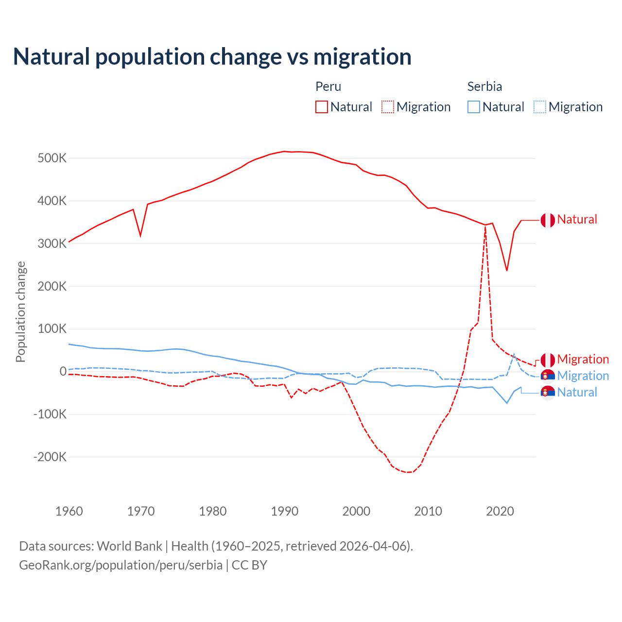 Over the last 10 years, 82% of the population change in Peru is from natural causes (a gain of 3,345,822 people) and 18% is from migration (a gain of 732,505 people). In Serbia 83.3% is from natural causes (a loss of 435,148 people) and 16.7% is from migration (a loss of 87,110 people).