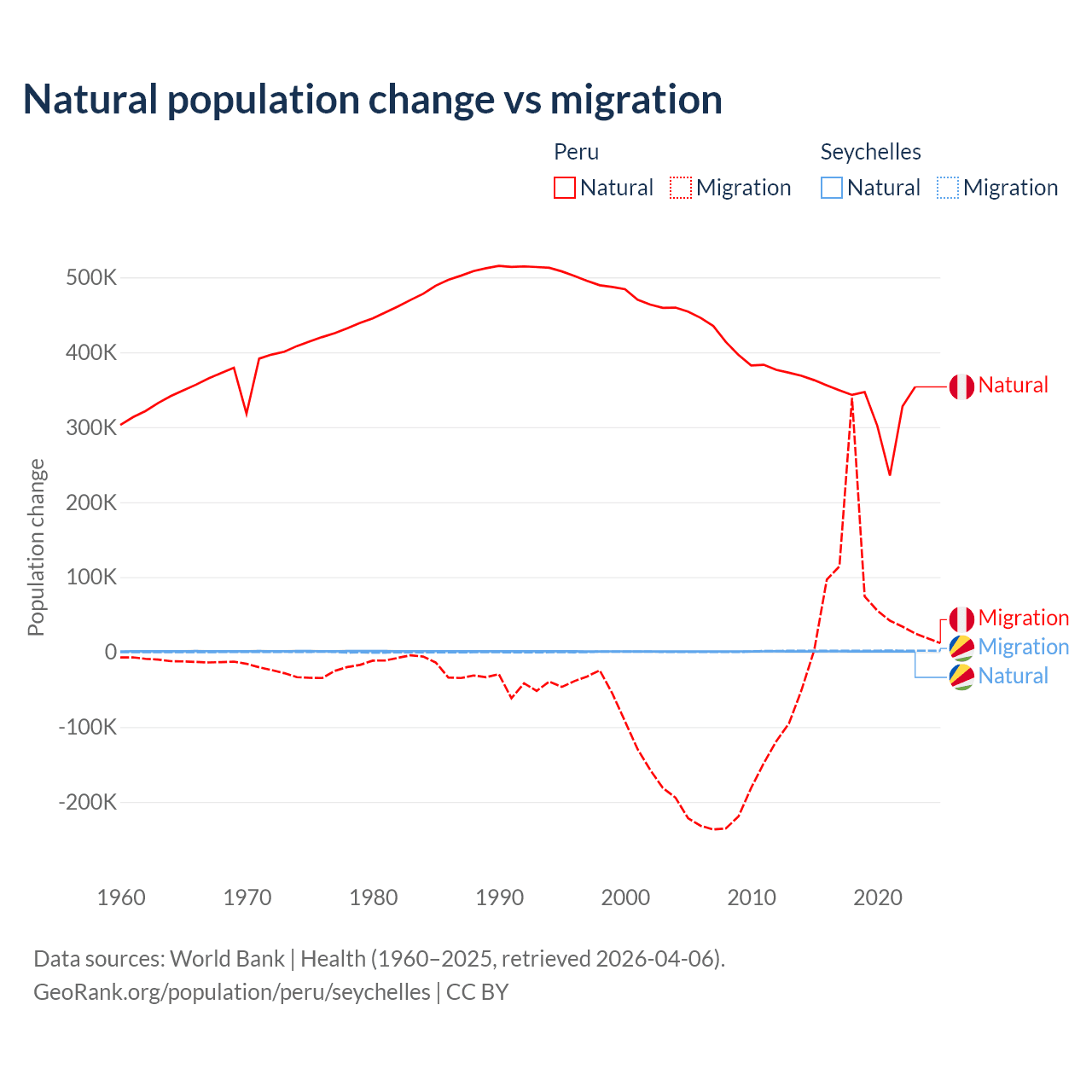Over the last 10 years, 82% of the population change in Peru is from natural causes (a gain of 3,345,822 people) and 18% is from migration (a gain of 732,505 people). In the Seychelles 31.4% is from natural causes (a gain of 8,122 people) and 68.6% is from migration (a gain of 17,748 people).