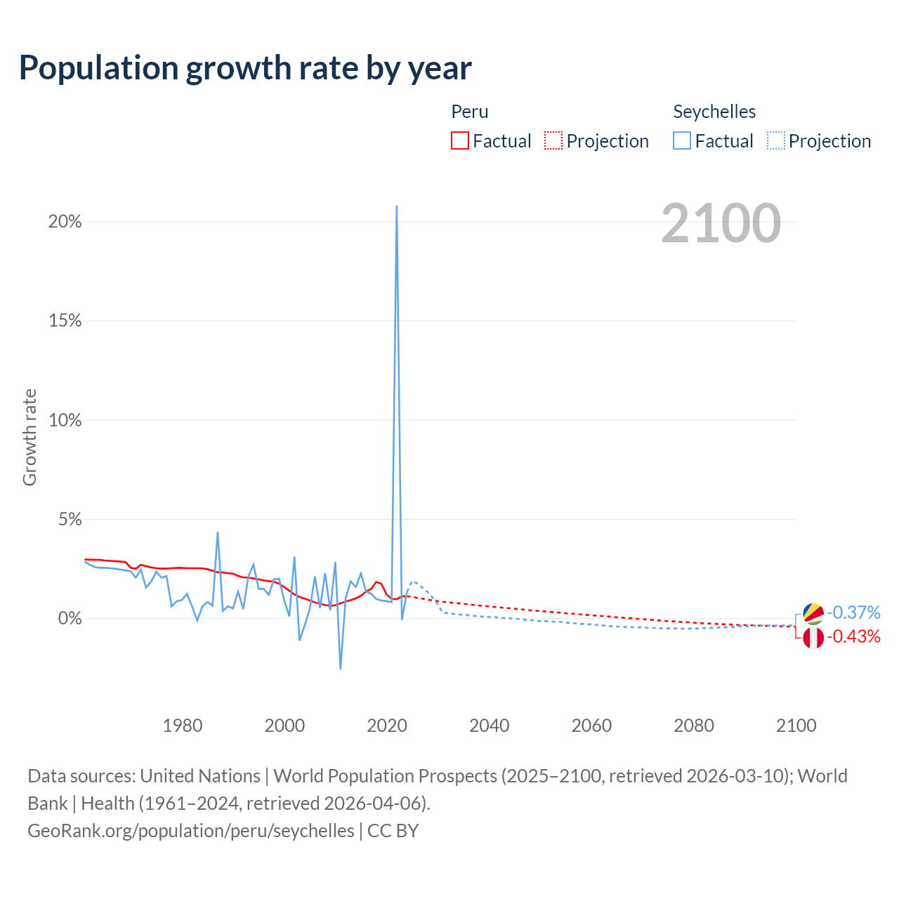 - For the last 10 years, Peru has had an average growth rate of +1.26% per year vs +2.9% in the Seychelles.
