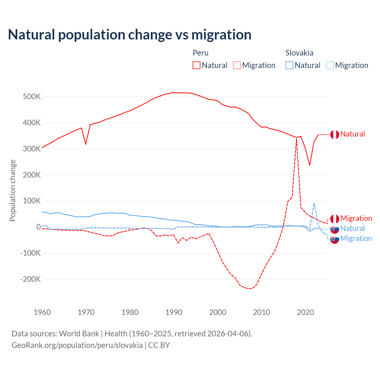 Over the last 10 years, 82% of the population change in Peru is from natural causes (a gain of 3,345,822 people) and 18% is from migration (a gain of 732,505 people). In Slovakia 7.47% is from natural causes (a loss of 8,728 people) and 92.5% is from migration (a gain of 108,156 people).