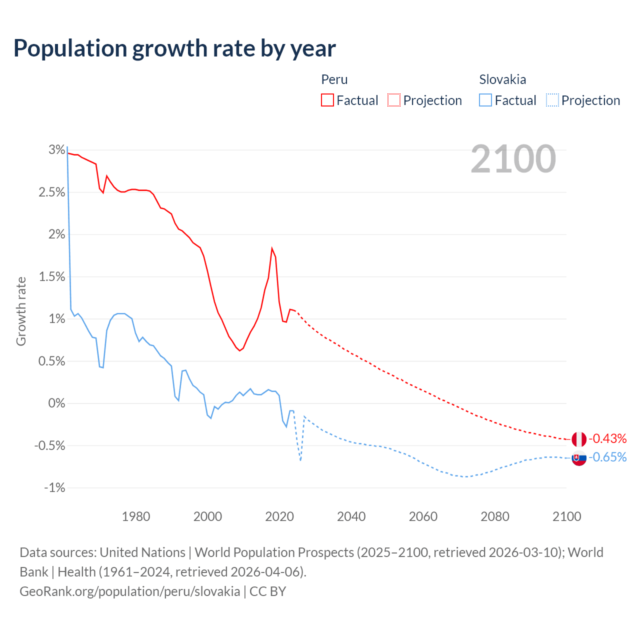 - For the last 10 years, Peru has had an average growth rate of +1.26% per year vs +0.01% in Slovakia.