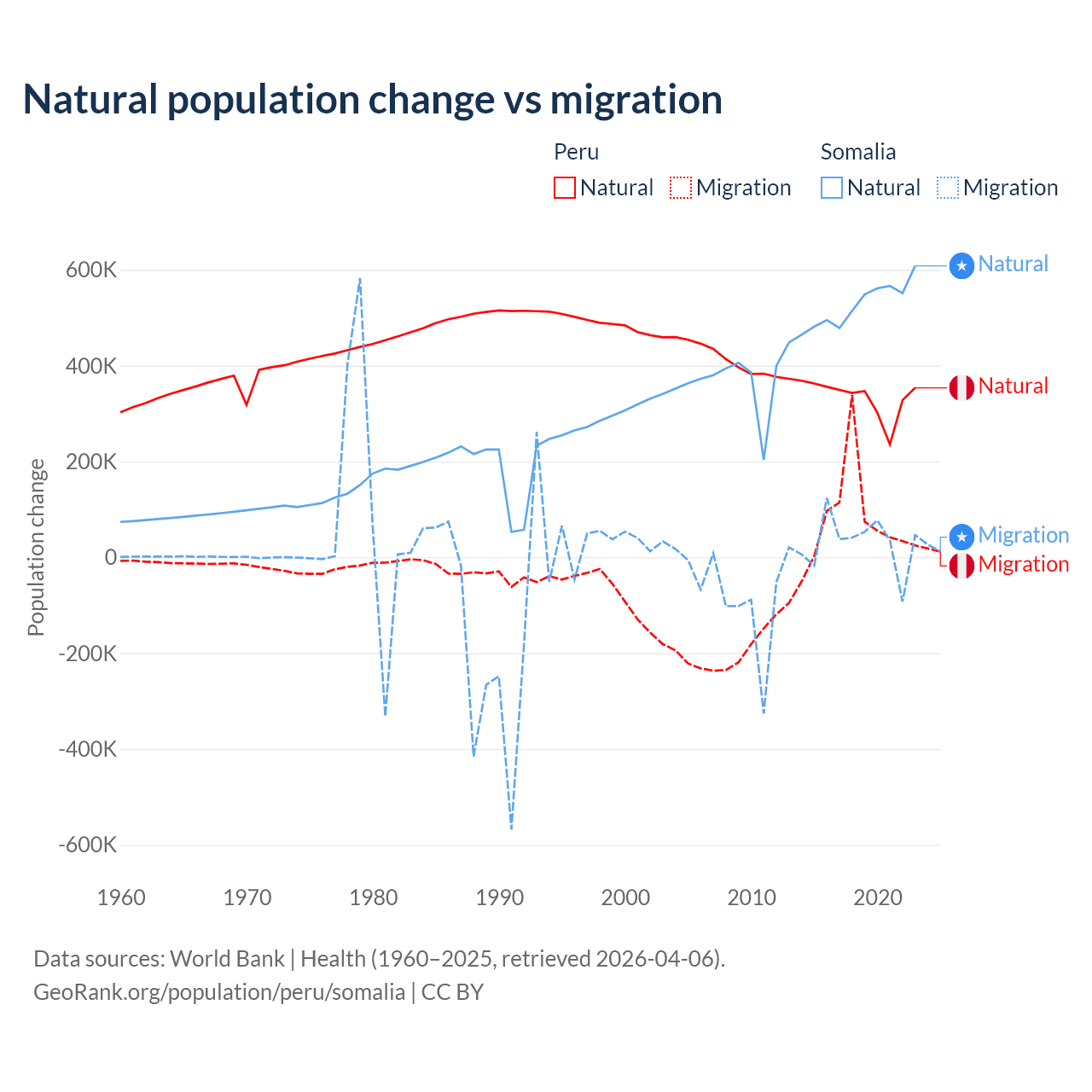 Over the last 10 years, 82% of the population change in Peru is from natural causes (a gain of 3,345,822 people) and 18% is from migration (a gain of 732,505 people). In Somalia 94.4% is from natural causes (a gain of 5,270,105 people) and 5.58% is from migration (a gain of 311,487 people).