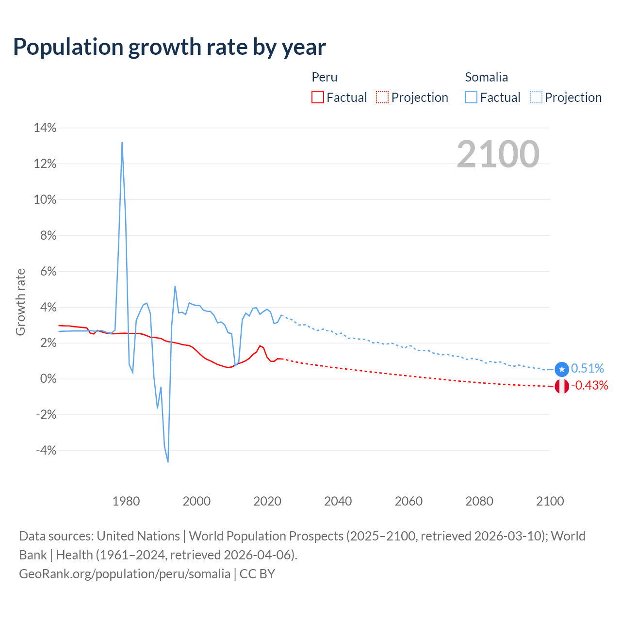 - For the last 10 years, Peru has had an average growth rate of +1.26% per year vs +3.61% in Somalia.