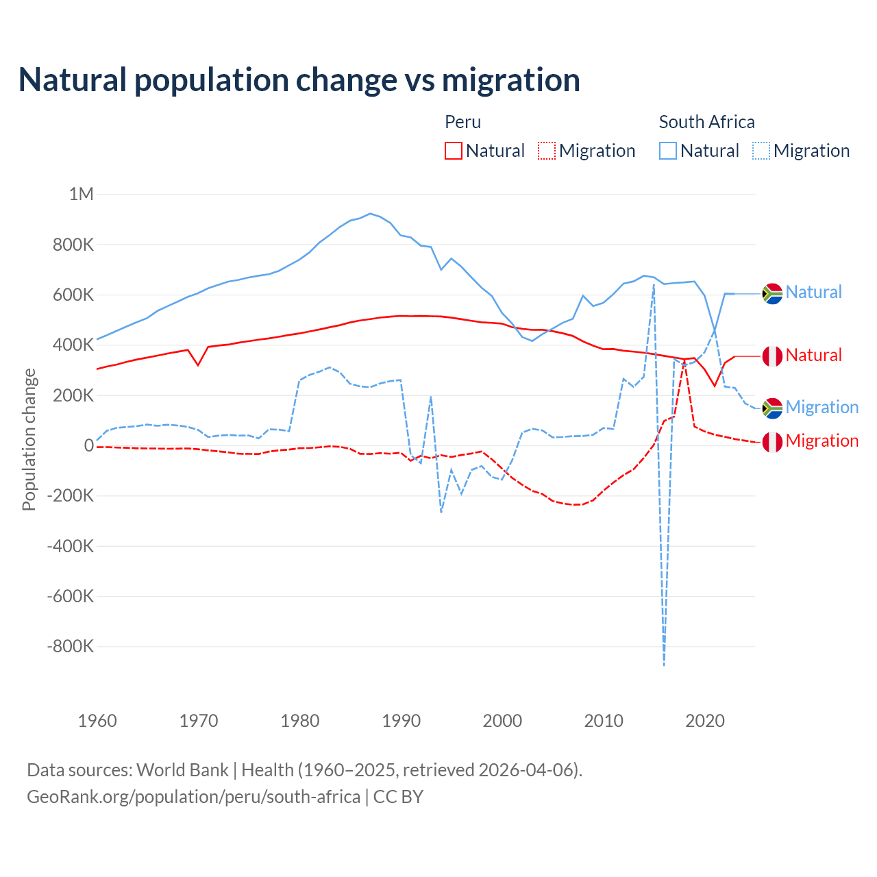 Over the last 10 years, 82% of the population change in Peru is from natural causes (a gain of 3,345,822 people) and 18% is from migration (a gain of 732,505 people). In South Africa 72.8% is from natural causes (a gain of 6,190,027 people) and 27.2% is from migration (a gain of 2,316,795 people).
