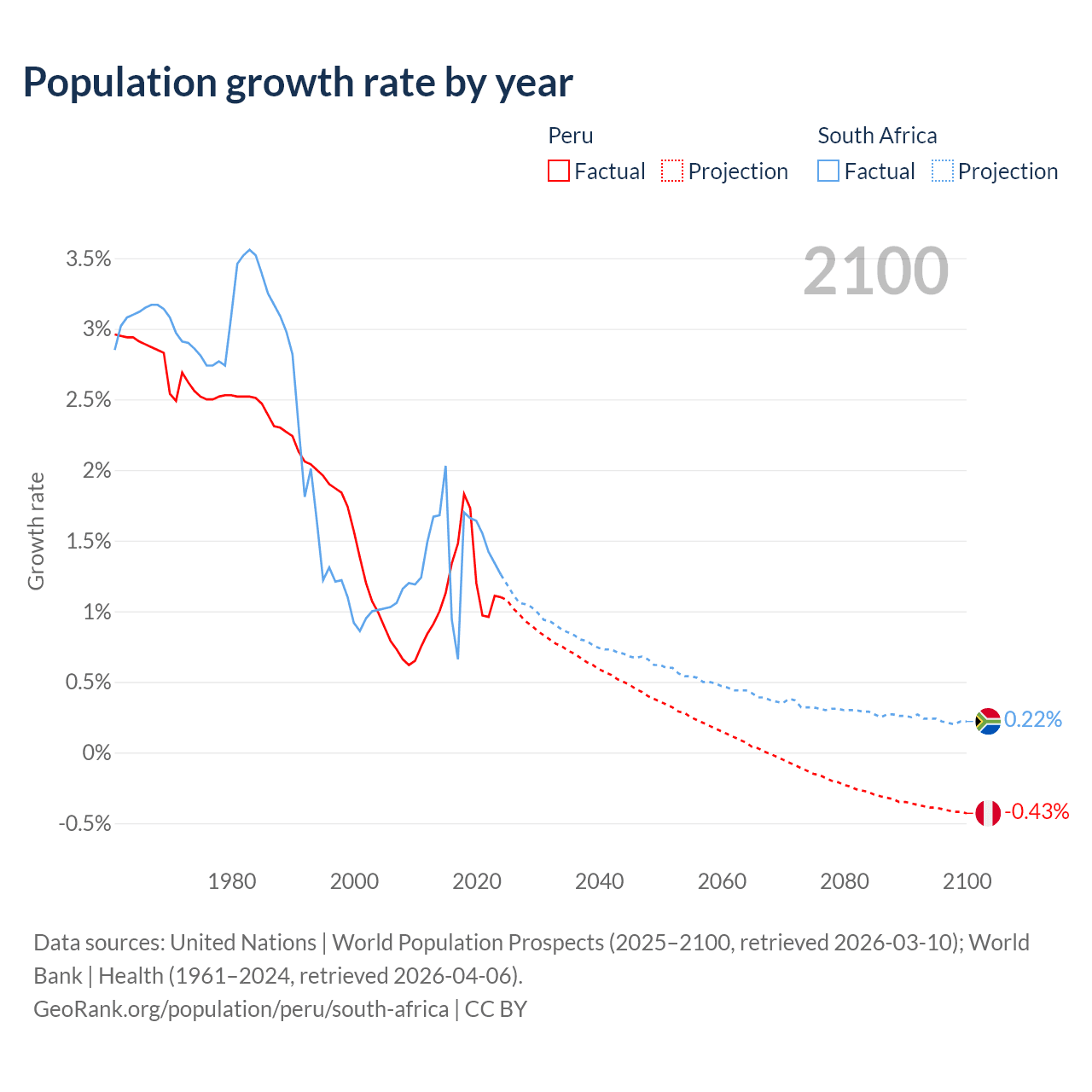 - For the last 10 years, Peru has had an average growth rate of +1.26% per year vs +1.44% in South Africa.