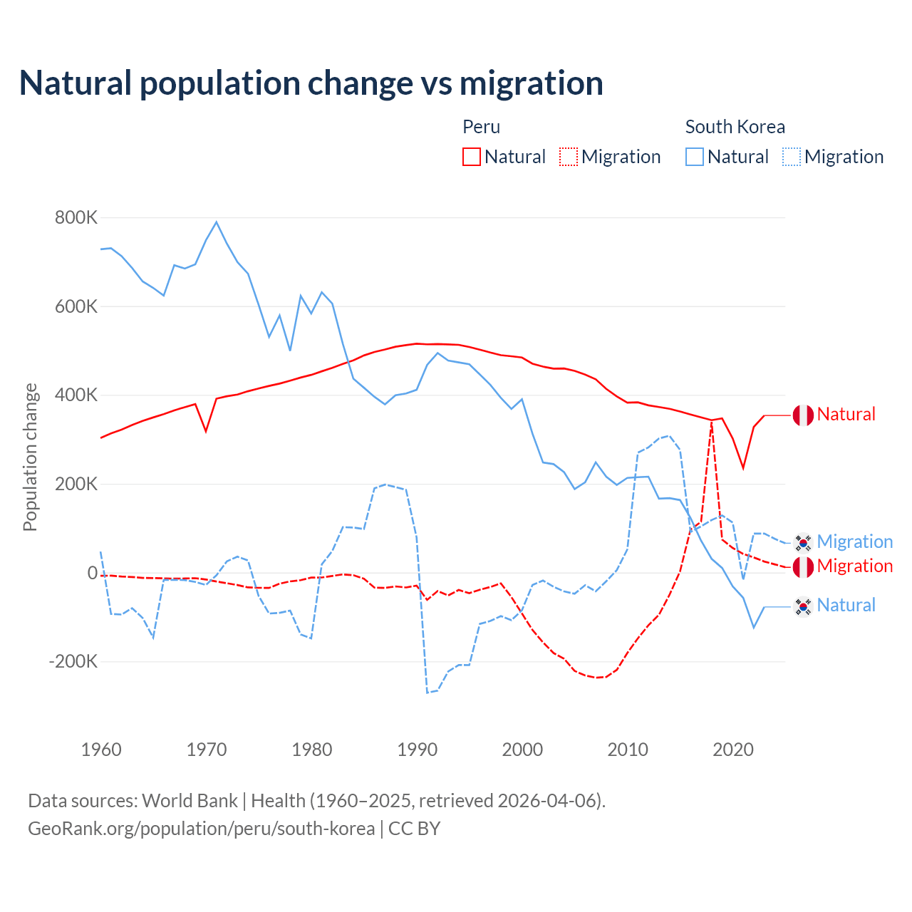 Over the last 10 years, 82% of the population change in Peru is from natural causes (a gain of 3,345,822 people) and 18% is from migration (a gain of 732,505 people). In South Korea 17.6% is from natural causes (a gain of 277,215 people) and 82.4% is from migration (a gain of 1,298,356 people).