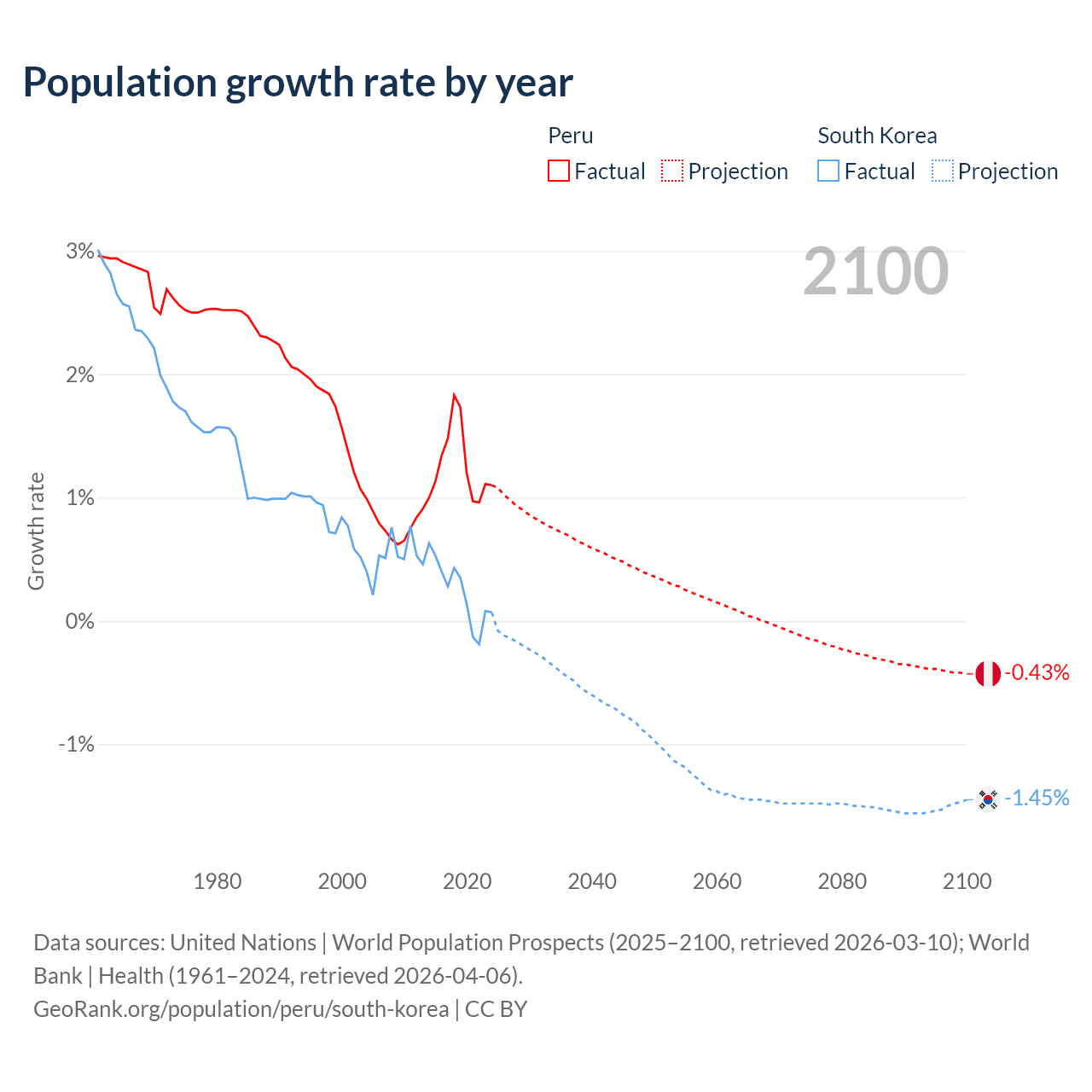 - For the last 10 years, Peru has had an average growth rate of +1.26% per year vs +0.24% in South Korea.