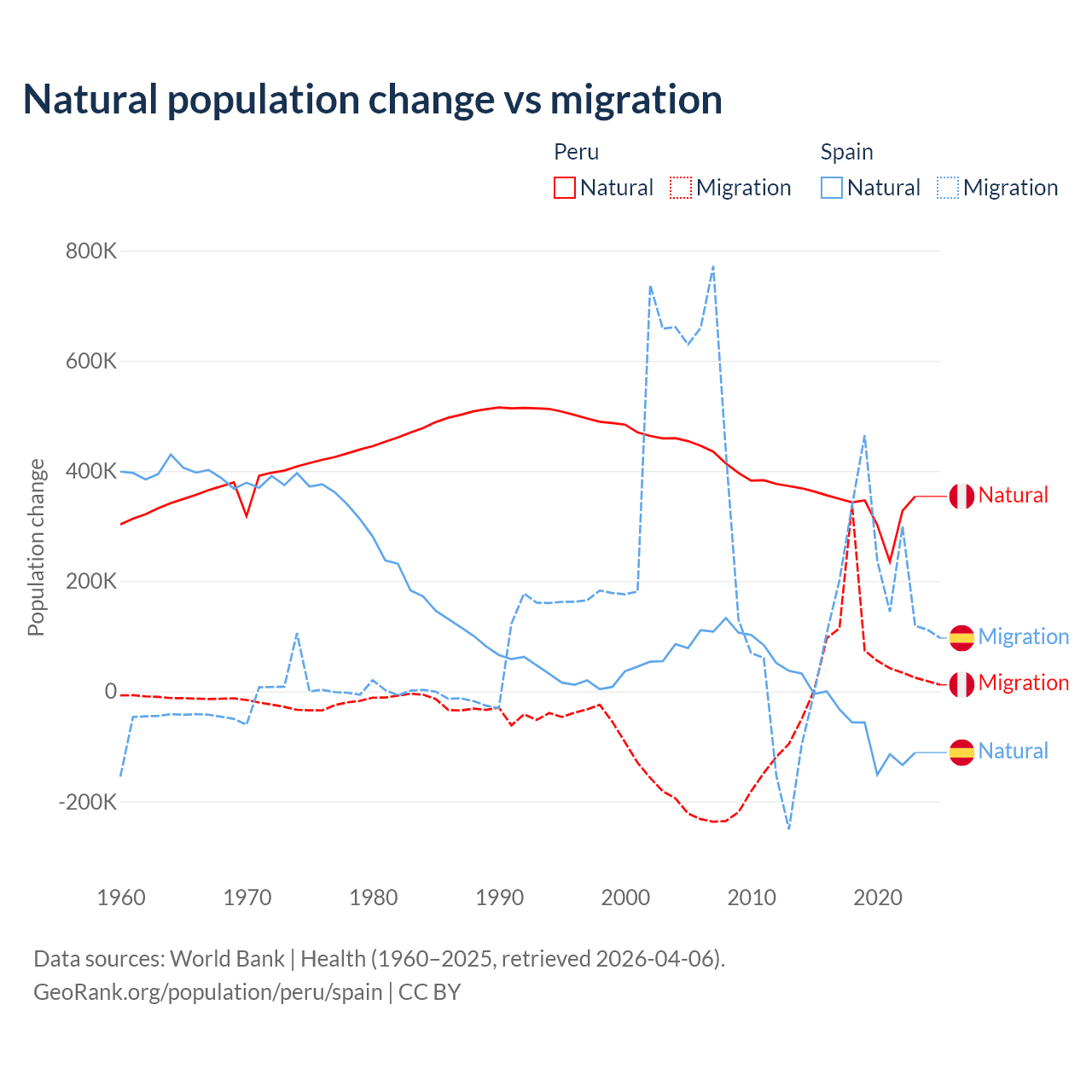 Over the last 10 years, 82% of the population change in Peru is from natural causes (a gain of 3,345,822 people) and 18% is from migration (a gain of 732,505 people). In Spain 25.8% is from natural causes (a loss of 627,829 people) and 74.2% is from migration (a gain of 1,810,127 people).