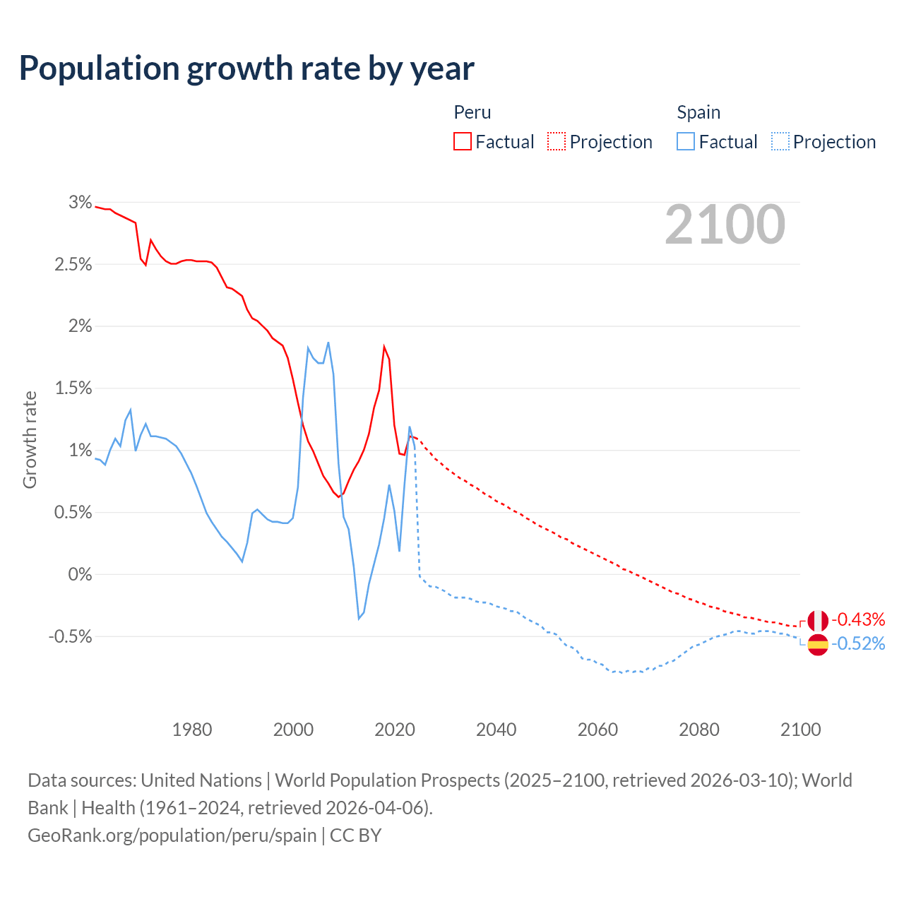 - For the last 10 years, Peru has had an average growth rate of +1.26% per year vs +0.43% in Spain.