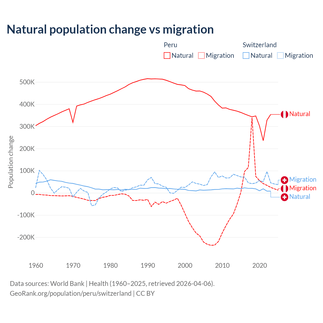 Over the last 10 years, 82% of the population change in Peru is from natural causes (a gain of 3,345,822 people) and 18% is from migration (a gain of 732,505 people). In Switzerland 21.6% is from natural causes (a gain of 165,354 people) and 78.4% is from migration (a gain of 600,145 people).