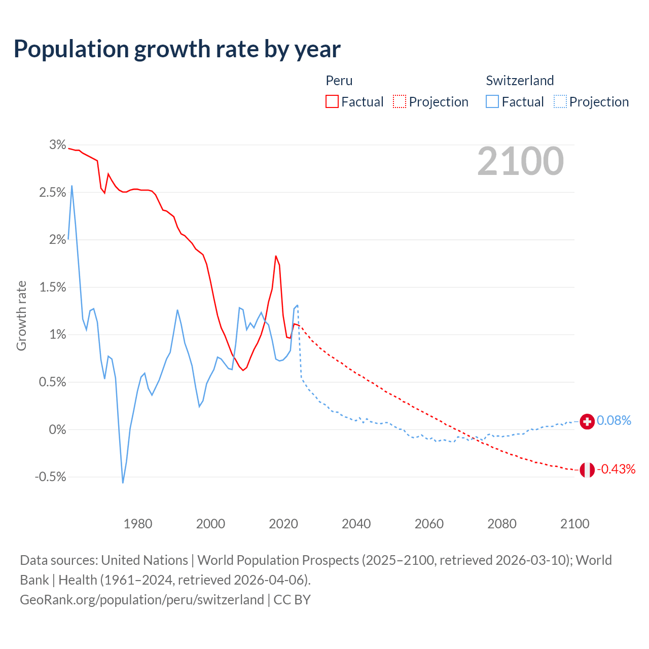 - For the last 10 years, Peru has had an average growth rate of +1.26% per year vs +0.98% in Switzerland.