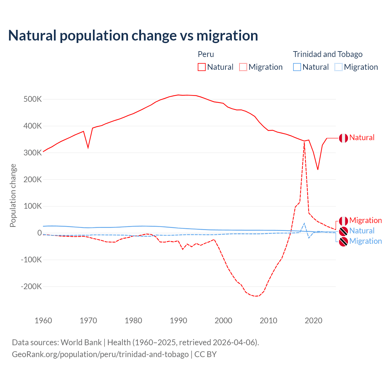 Over the last 10 years, 82% of the population change in Peru is from natural causes (a gain of 3,345,822 people) and 18% is from migration (a gain of 732,505 people). In Trinidad and Tobago 66% is from natural causes (a gain of 55,887 people) and 34% is from migration (a gain of 28,785 people).