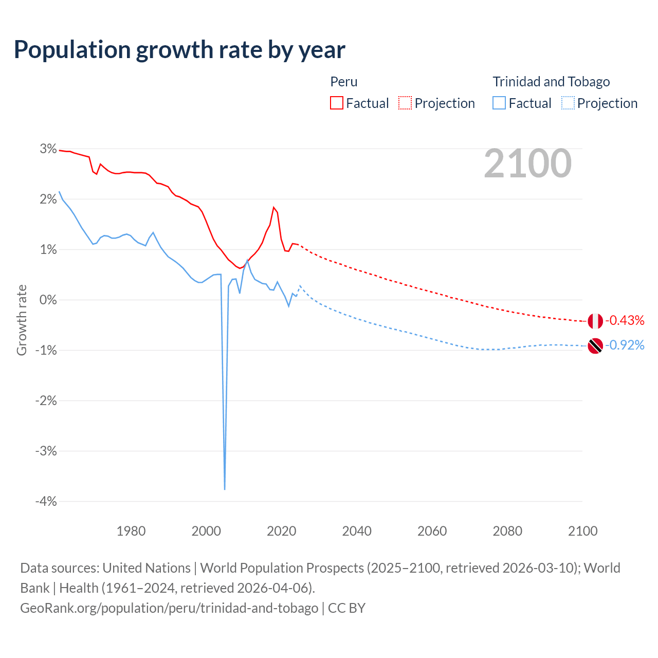 - For the last 10 years, Peru has had an average growth rate of +1.26% per year vs +0.19% in Trinidad and Tobago.