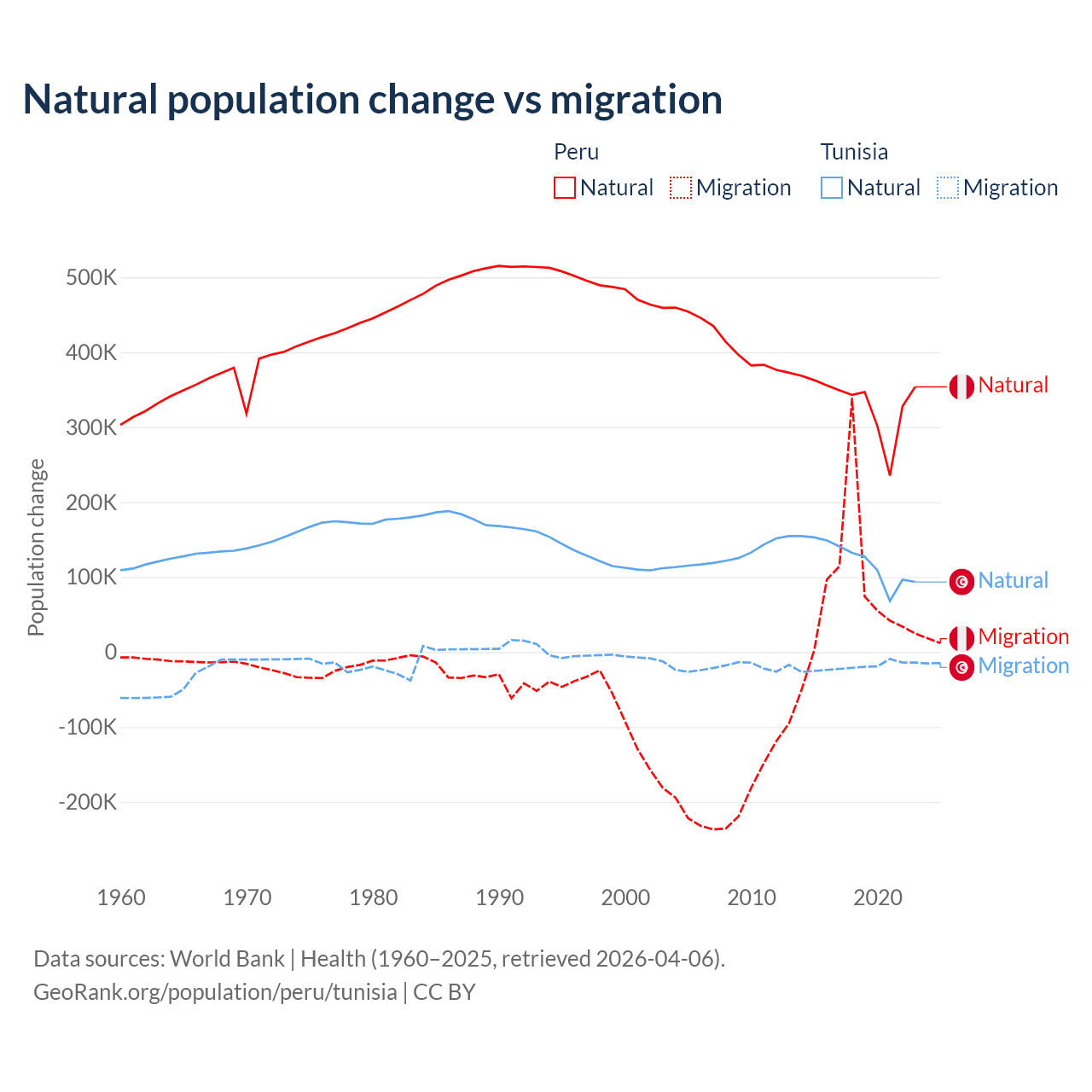 Over the last 10 years, 82% of the population change in Peru is from natural causes (a gain of 3,345,822 people) and 18% is from migration (a gain of 732,505 people). In Tunisia 86.3% is from natural causes (a gain of 1,225,079 people) and 13.7% is from migration (a loss of 195,011 people).