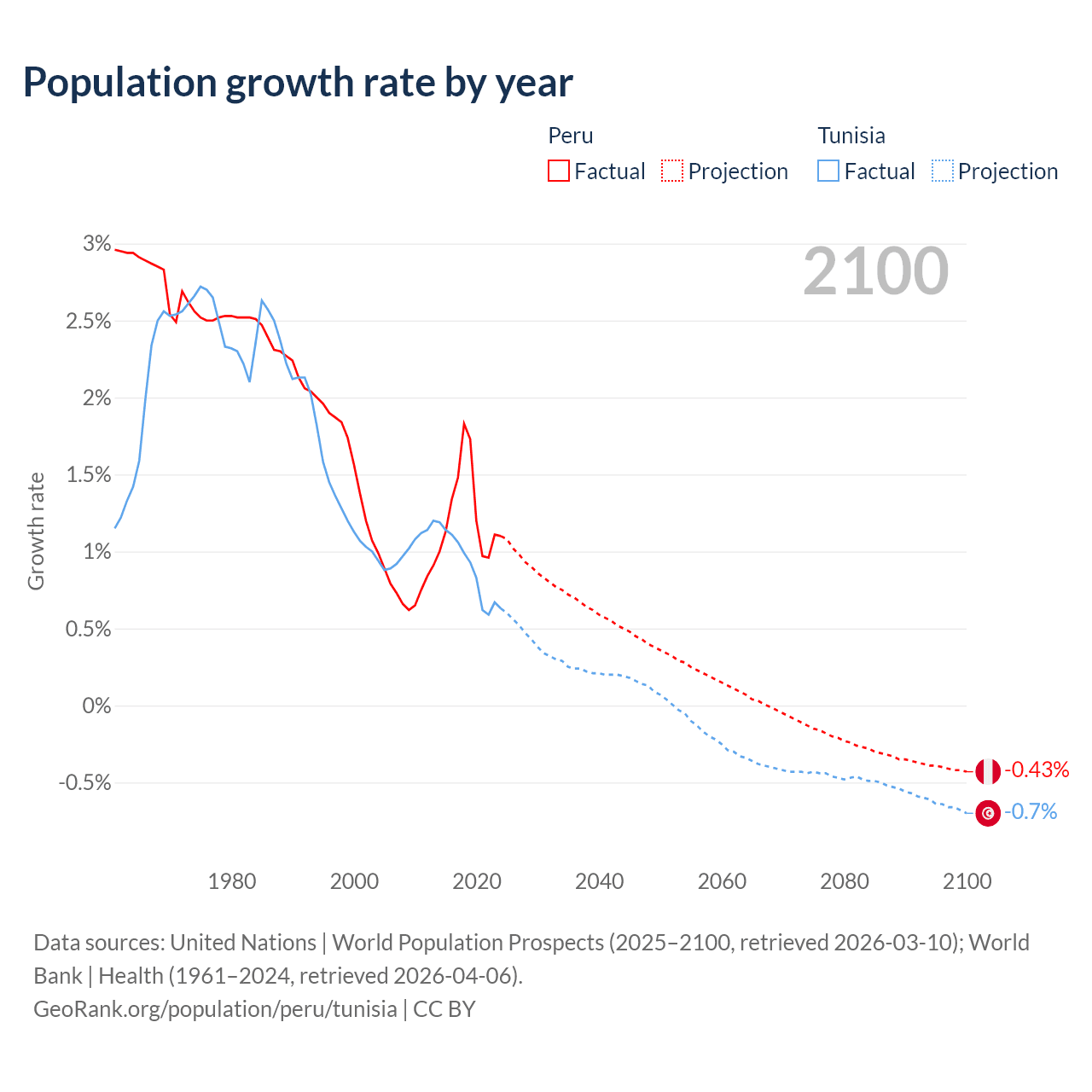 - For the last 10 years, Peru has had an average growth rate of +1.26% per year vs +0.89% in Tunisia.