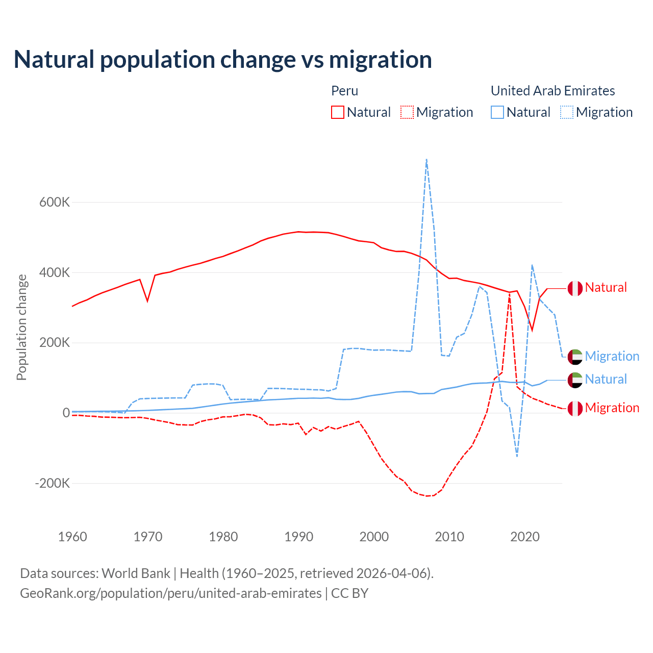 Over the last 10 years, 82% of the population change in Peru is from natural causes (a gain of 3,345,822 people) and 18% is from migration (a gain of 732,505 people). In the United Arab Emirates 30.5% is from natural causes (a gain of 857,996 people) and 69.5% is from migration (a gain of 1,958,520 people).