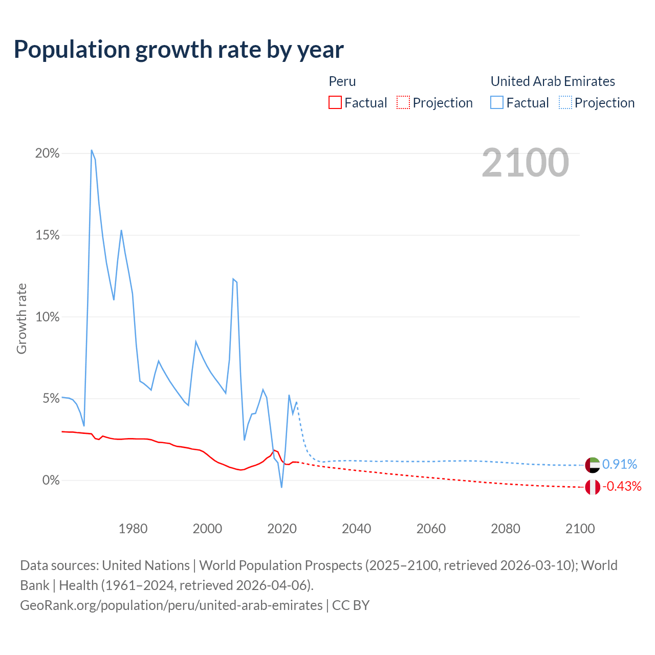 - For the last 10 years, Peru has had an average growth rate of +1.26% per year vs +3.31% in the United Arab Emirates.