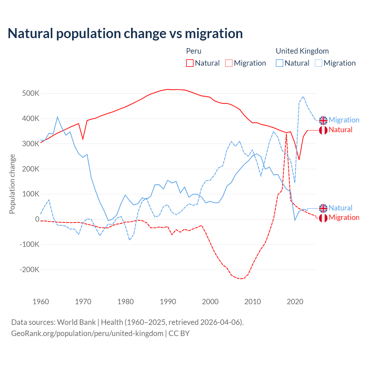 Over the last 10 years, 82% of the population change in Peru is from natural causes (a gain of 3,345,822 people) and 18% is from migration (a gain of 732,505 people). In the United Kingdom 23.9% is from natural causes (a gain of 1,033,129 people) and 76.1% is from migration (a gain of 3,283,101 people).