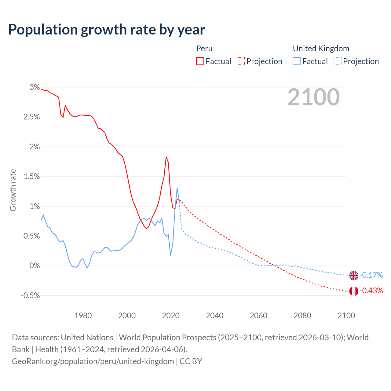 - For the last 10 years, Peru has had an average growth rate of +1.26% per year vs +0.7% in the United Kingdom.