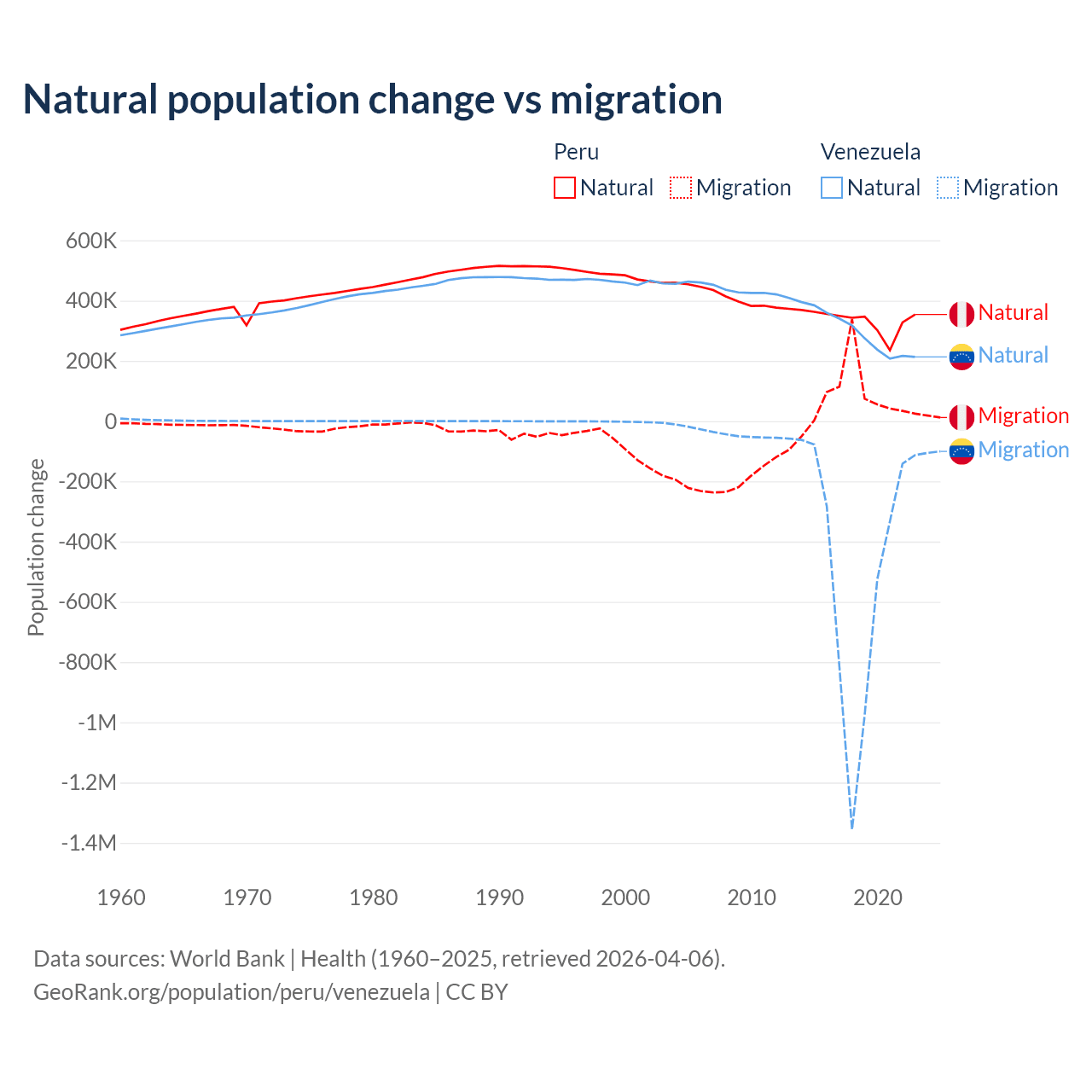 Over the last 10 years, 82% of the population change in Peru is from natural causes (a gain of 3,345,822 people) and 18% is from migration (a gain of 732,505 people). In Venezuela 38.6% is from natural causes (a gain of 2,946,257 people) and 61.4% is from migration (a loss of 4,683,227 people).