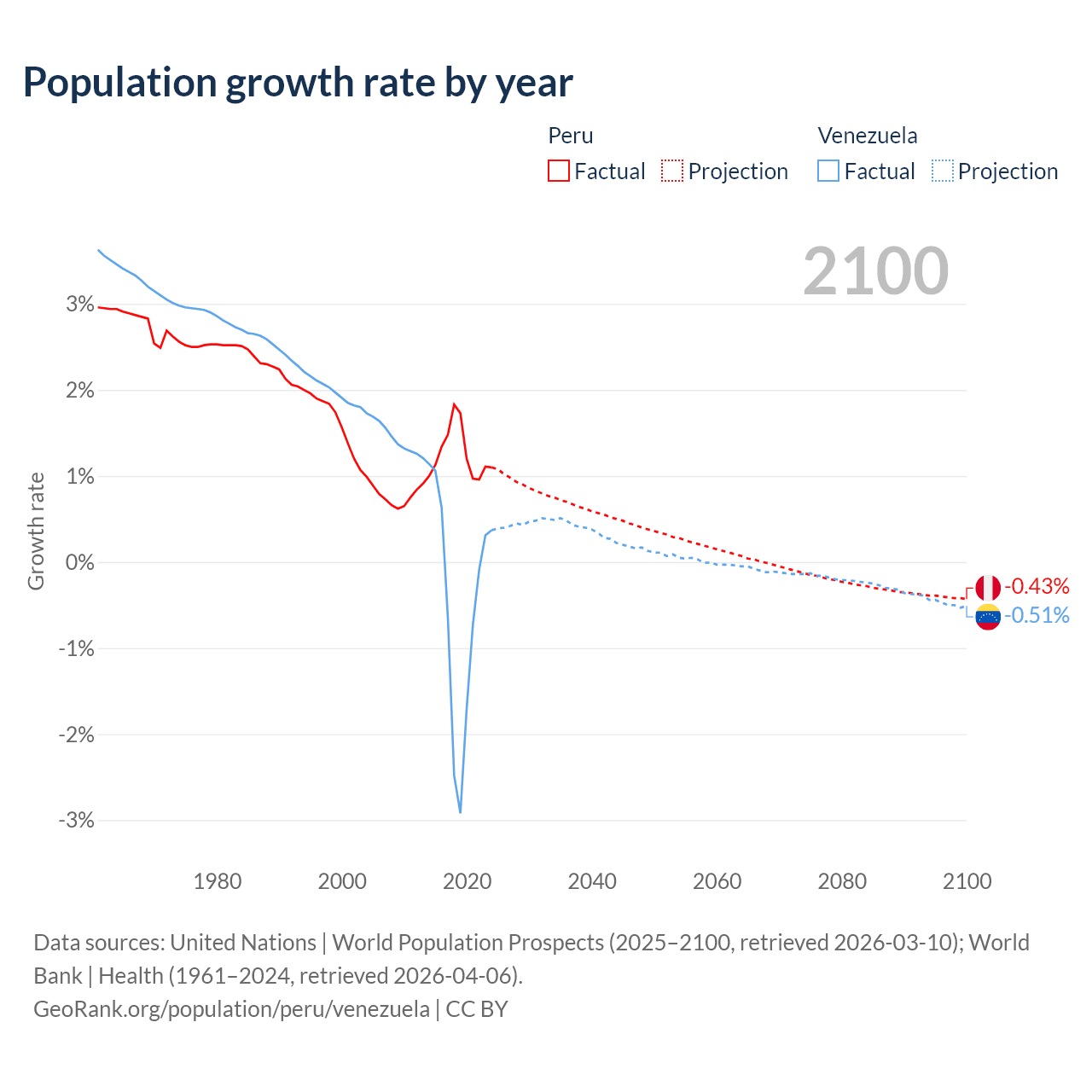 - For the last 10 years, Peru has had an average growth rate of +1.26% per year vs -0.46% in Venezuela.