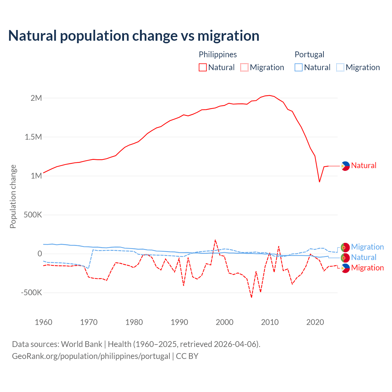 Over the last 10 years, 88.5% of the population change in the Philippines is from natural causes (a gain of 14,279,705 people) and 11.5% is from migration (a loss of 1,848,117 people). In Portugal 51% is from natural causes (a loss of 302,748 people) and 49% is from migration (a gain of 290,554 people).