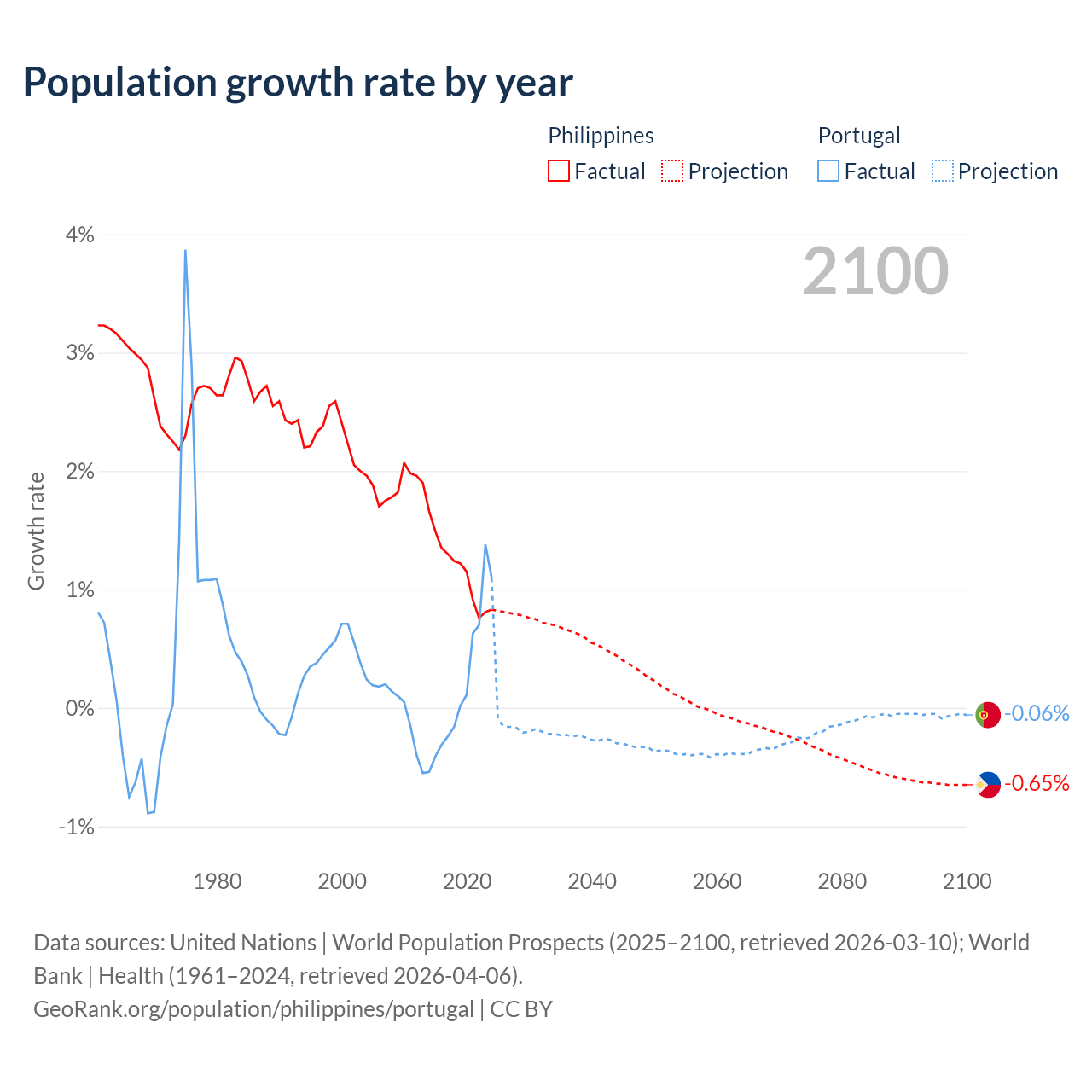 - For the last 10 years, the Philippines has had an average growth rate of +1.16% per year vs +0.21% in Portugal.