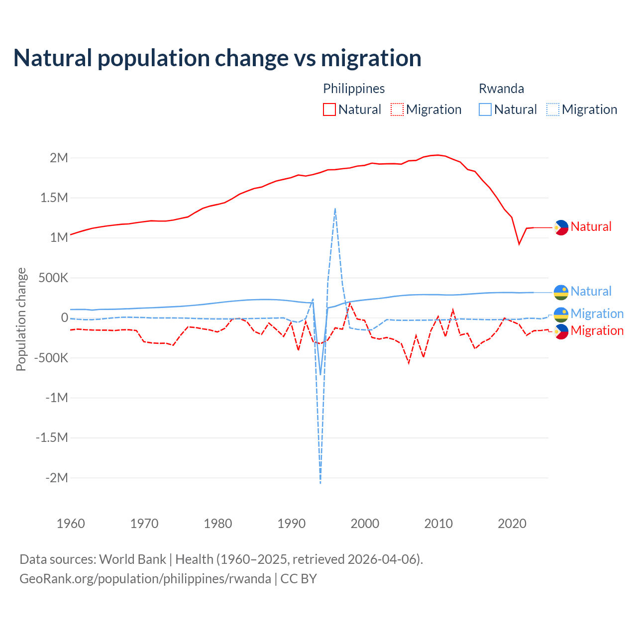 Over the last 10 years, 88.5% of the population change in the Philippines is from natural causes (a gain of 14,279,705 people) and 11.5% is from migration (a loss of 1,848,117 people). In Rwanda 93.8% is from natural causes (a gain of 3,081,296 people) and 6.18% is from migration (a loss of 203,035 people).
