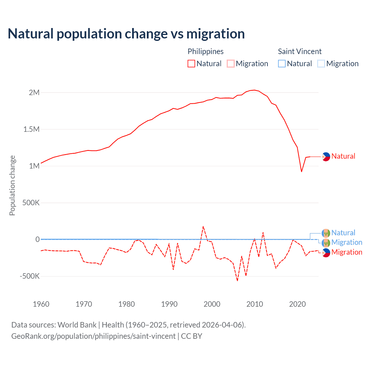Over the last 10 years, 88.5% of the population change in the Philippines is from natural causes (a gain of 14,279,705 people) and 11.5% is from migration (a loss of 1,848,117 people). In Saint Vincent 21.2% is from natural causes (a gain of 2,525 people) and 78.8% is from migration (a loss of 9,393 people).