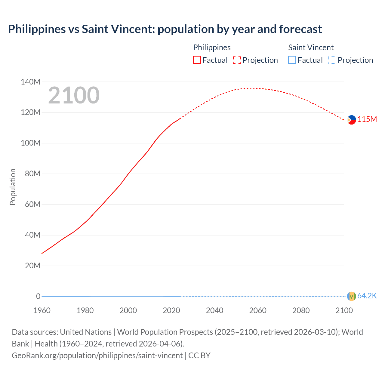 The latest officially reported population of the Philippines was 115,843,670 in 2024 vs 100,616 people in Saint Vincent in 2024. In 2026, based on the adjusted UN estimation, the current Philippines' population is 117,991,570 people compared to 99,237 in Saint Vincent.