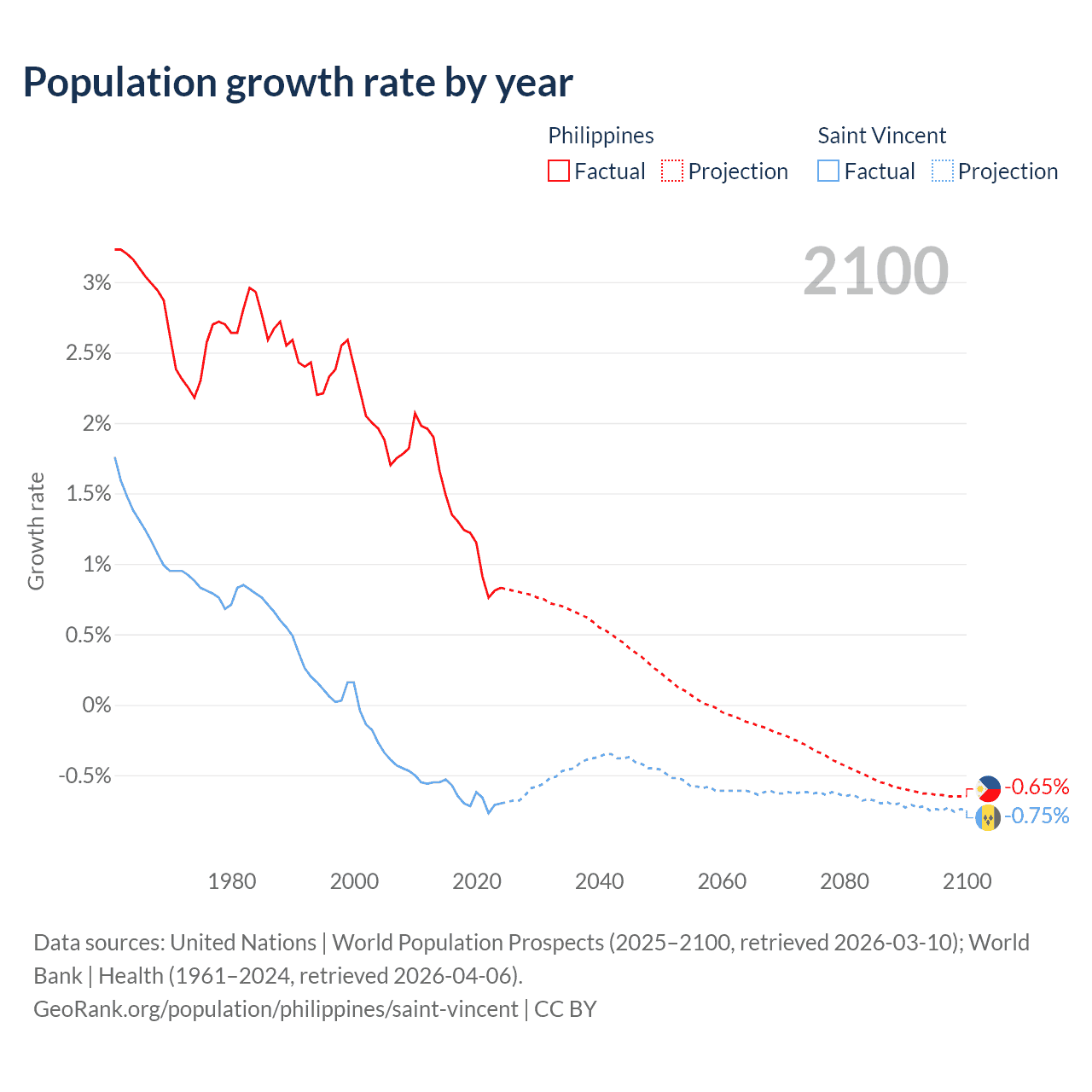 - For the last 10 years, the Philippines has had an average growth rate of +1.16% per year vs -0.65% in Saint Vincent.